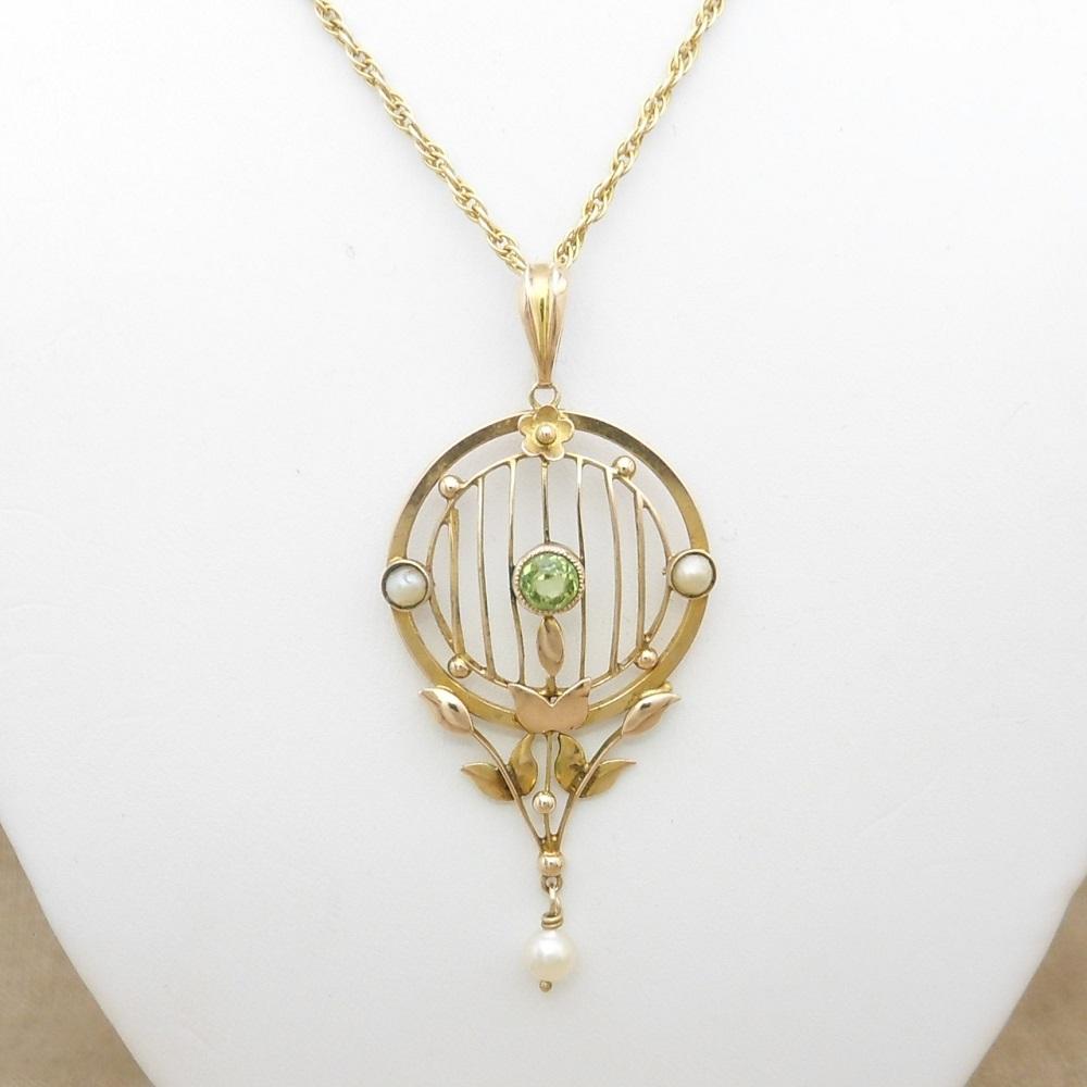Fine Art Nouveau 9ct Gold Peridot & Pearl Pendant