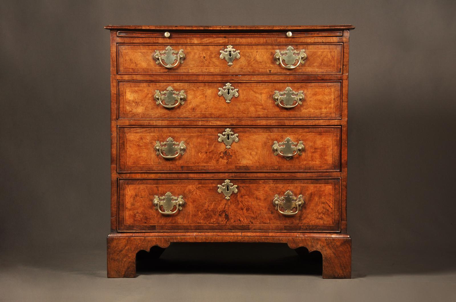 A fine and rare early 18th Century Walnut Chest Of Drawers of Small proportions having four long drawers with brushing slide. Matched figured Walnut and burr walnut veneers throughout with fine feather banding. The Chest is a superb light colour that glows. All the clean original drawer linings and back boards are made in oak. Handles replaced through the same holes with good period examples, escutcheons are original.