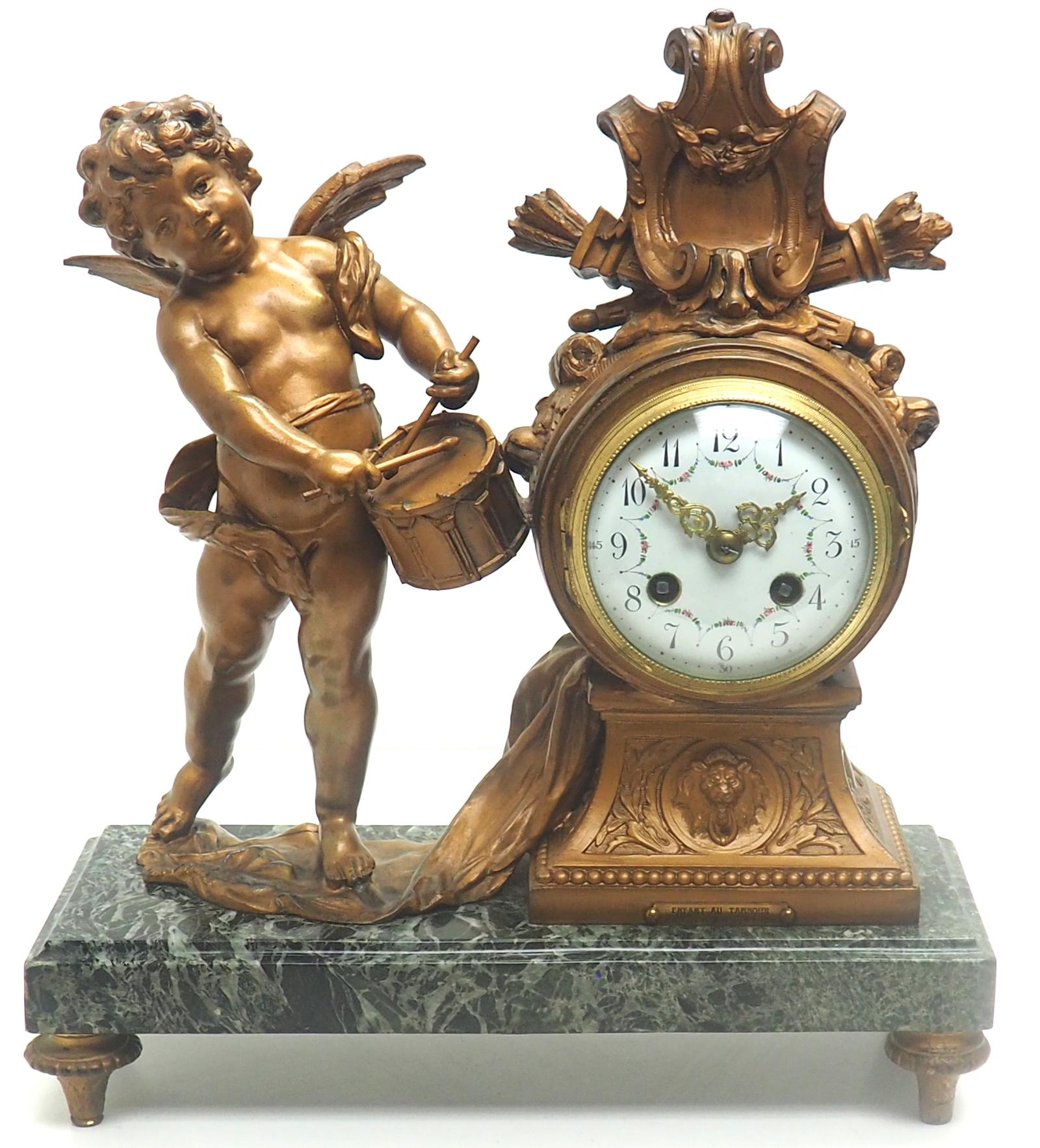 Fine French 8-day Drumming Cherub Enamel Dial French Figural Mantle Clock on Marble Base