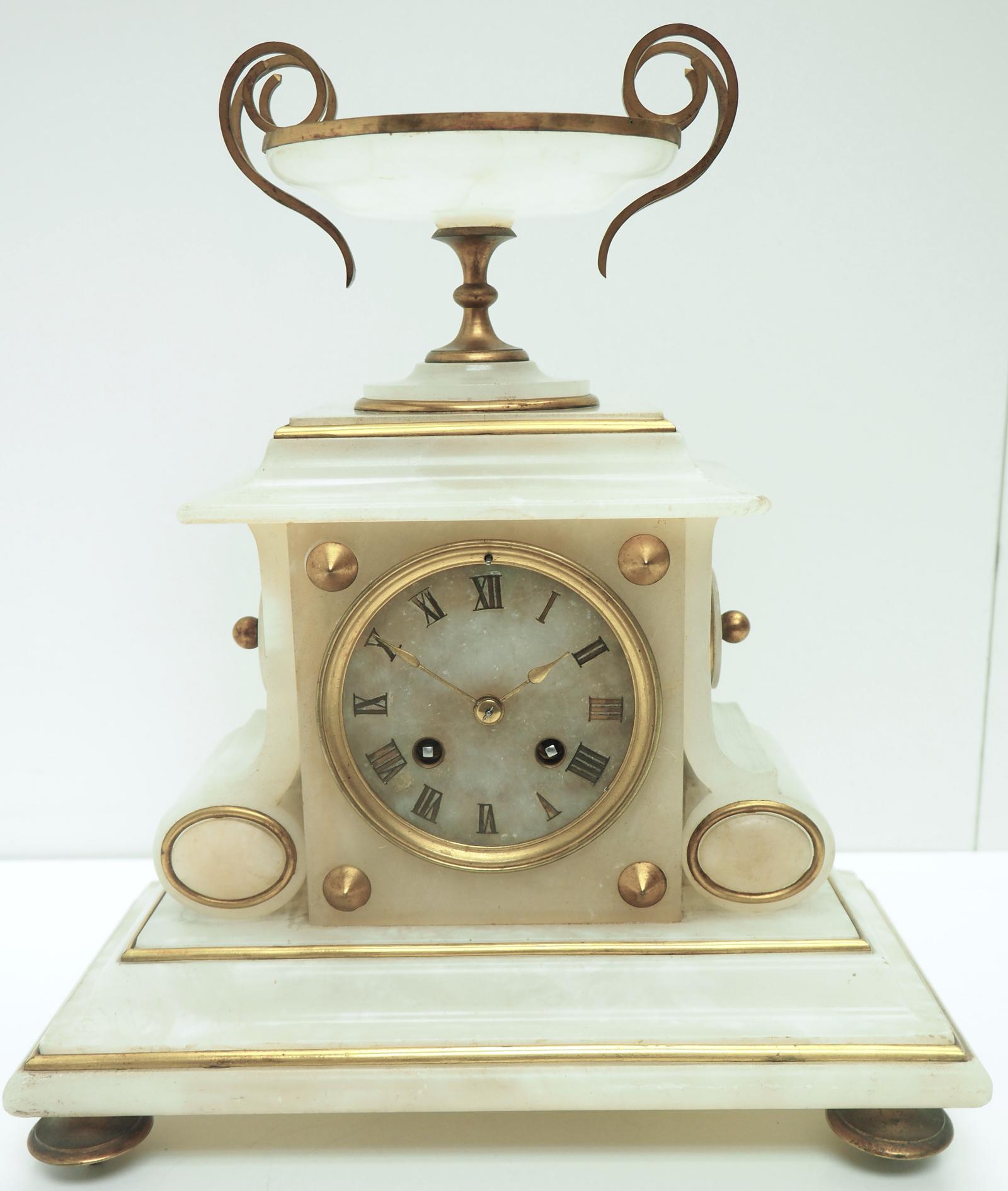 Fine French 8-Day Mantel Clock Alabaster Clock with Ormolu Mounts Striking A Bell (1 of 10)