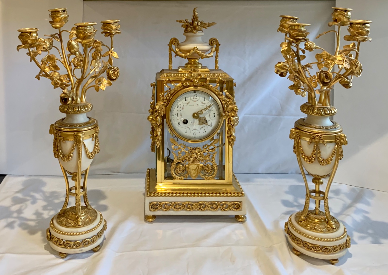 Fine French Gilt Bronze Four Glass Clock Set by Gerard Paris Early 19th Century