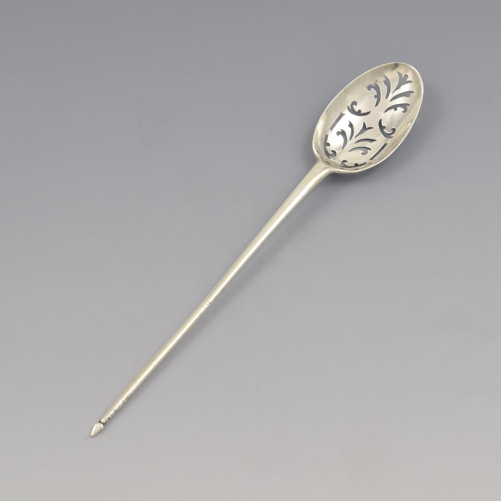 A lovely early Georgian silver mote spoon, with nice quality hand pierced detail of a more unusual pattern of scrolled foliate shapes rather than the common scroll and crosslets type arrangement. It has a small applied point to the end of the stem handle for clearing out clogged teapot strainers. Lion passant mark to the handle and maker's initials for Jeremiah Lee, c.1728-1832. The initials RA are also engraved to the bottom of the heel, which was likely the original owner's initials although rather crudely executed.