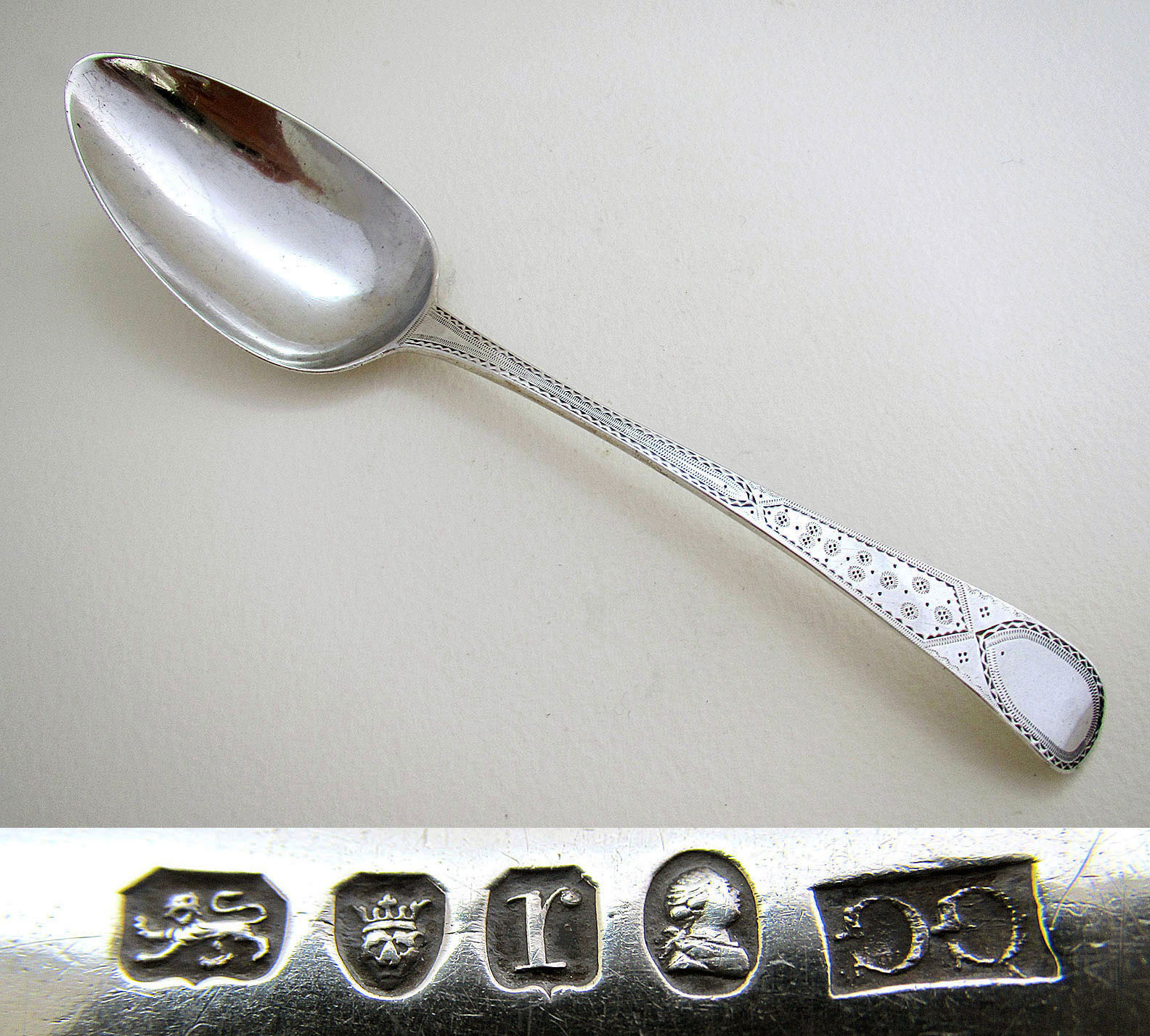 Fine George III Engraved Bright-Cut Solid Sterling Silver Antique Table / Serving Spoon. English Hallmarked 1792