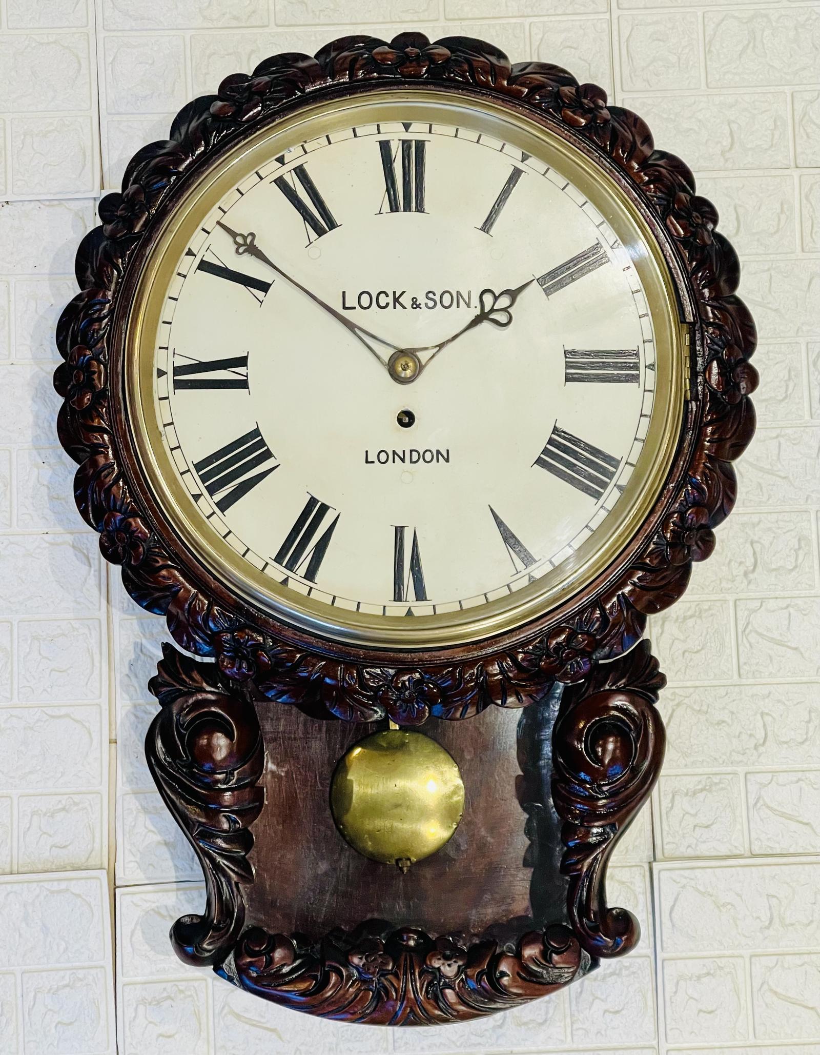 Clockwise is delighted to present for your consideration a fine example of a Georgian eight day drop-dial fusee wall clock. This unusual mahogany example has a 12 inch dial with 'Lock & Son, London' notated to the dial and the clock is carved with flower heads and stylised scrolling acanthus surrounding both the dial and the large lower viewing window.