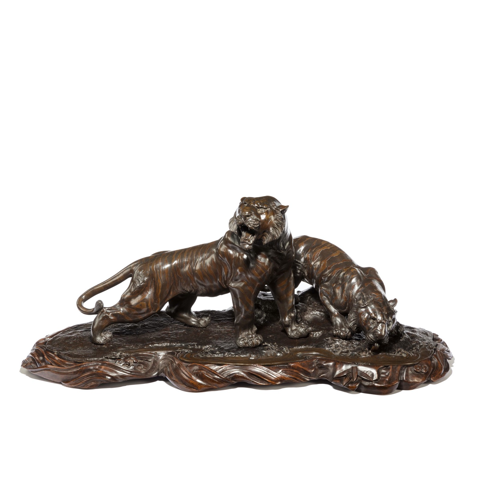 Fine & Large Meiji Period Bronze of Two Tigers by Genryusai Seiya
