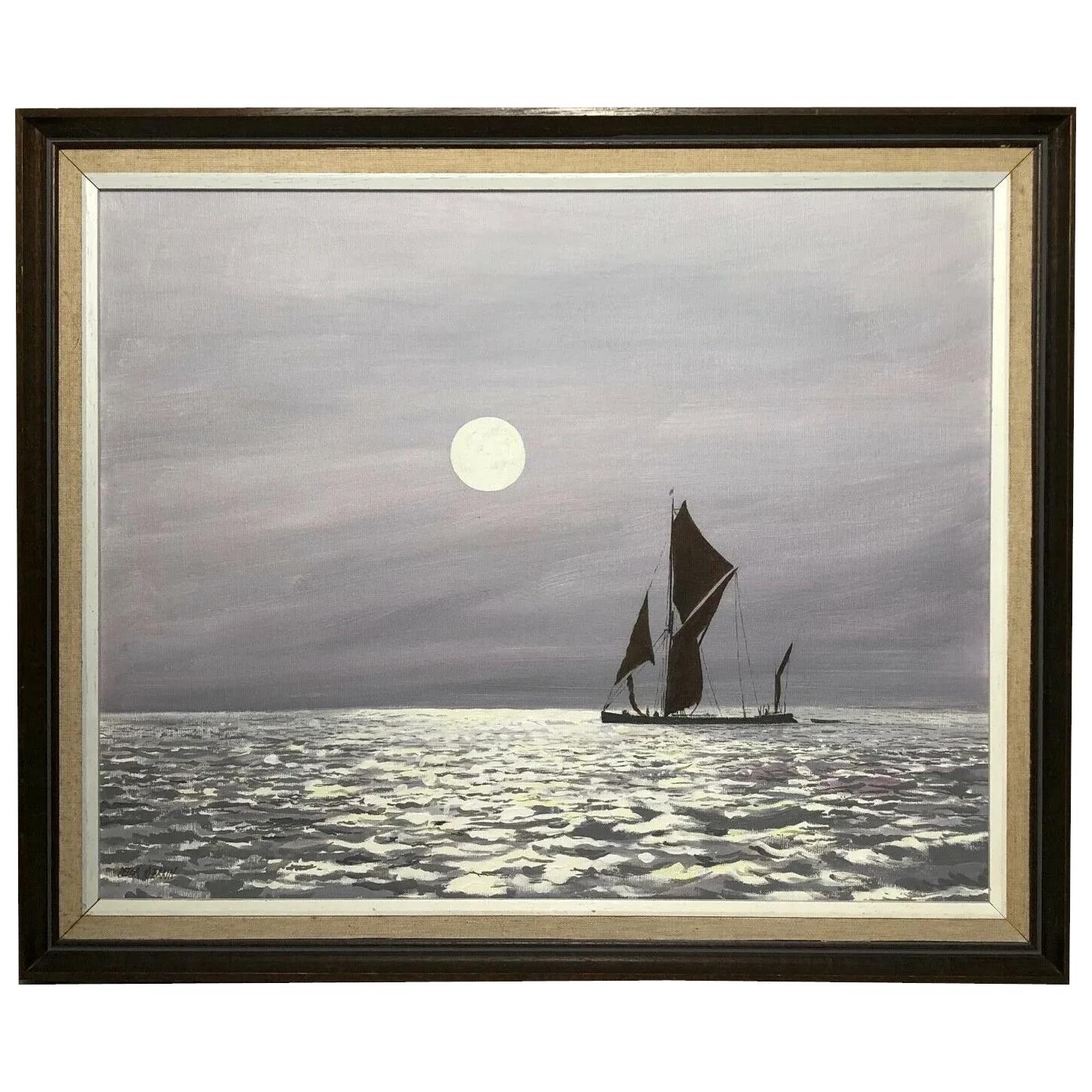 Fine Marine Oil Painting "Sailing Yacht Ship Calm Seas Illuminated by Moonlight"
