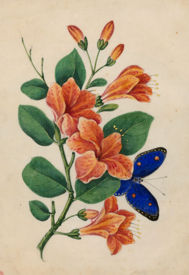 Fine Mid 19th Century Gouache - Lilies and a Blue Butterfly