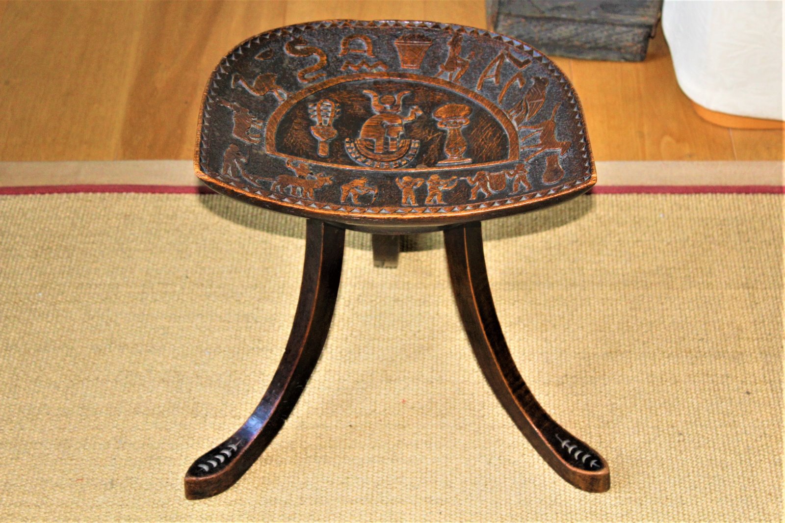 Fine Oak Thebes Stool the Seat Finely Carved with Egyption Symbols Designed by Leonard Wyburd for Libertys of London English c.1890