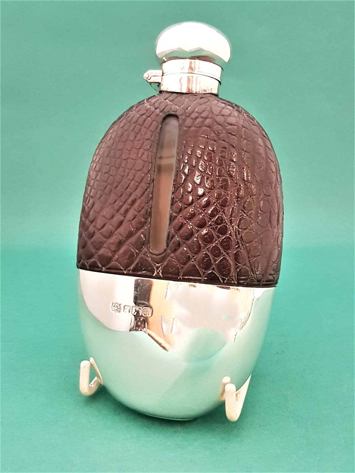 Fine Oval Antique Edwardian Silver, Crocodile Skin & Glass Hip Flask