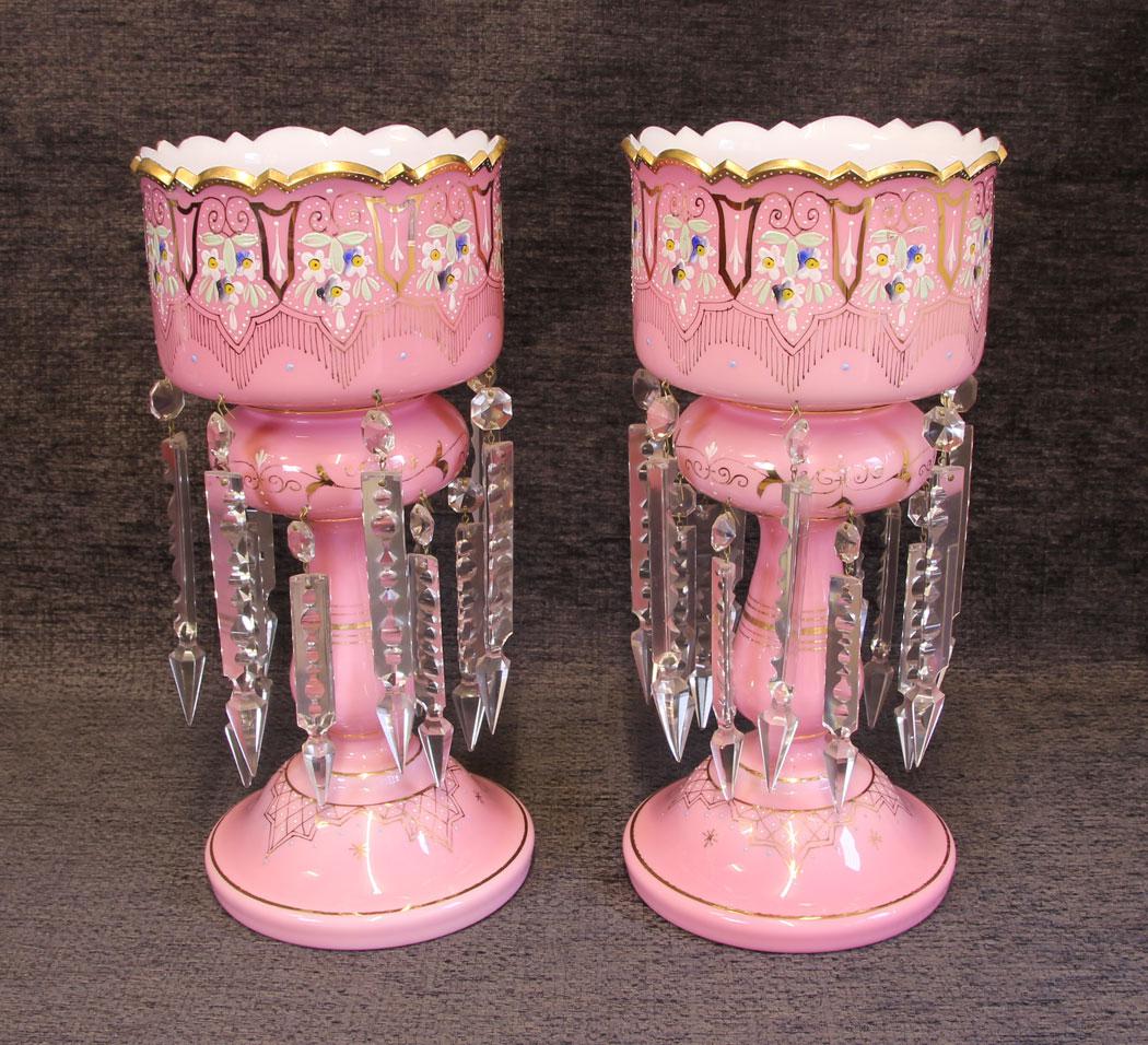 Fine Pair of Antique Victorian Pink Opaline Mantle Lustres