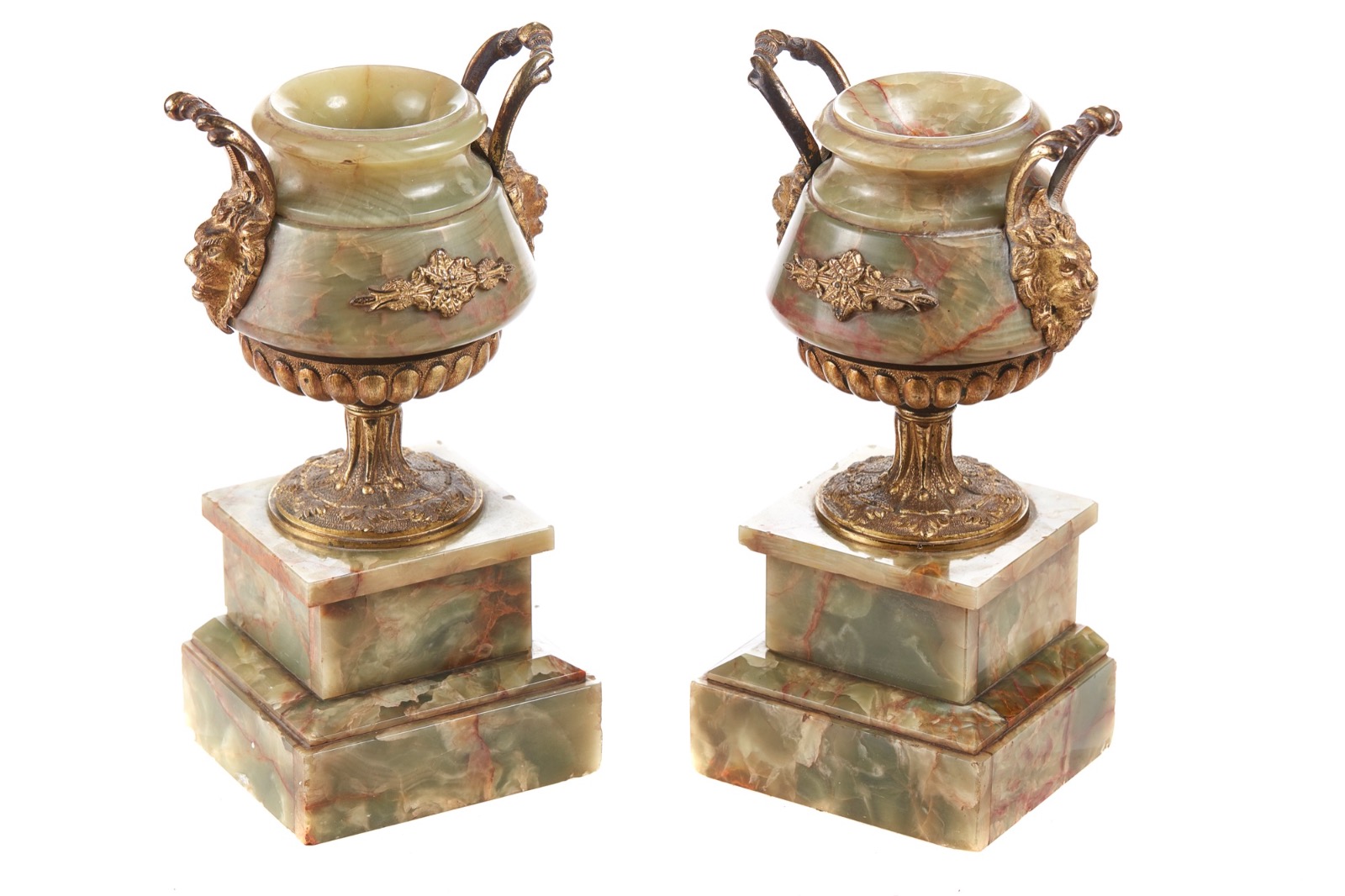 Fine Pair of French Antique Onyx & Gilt Metal Mounted Urns
