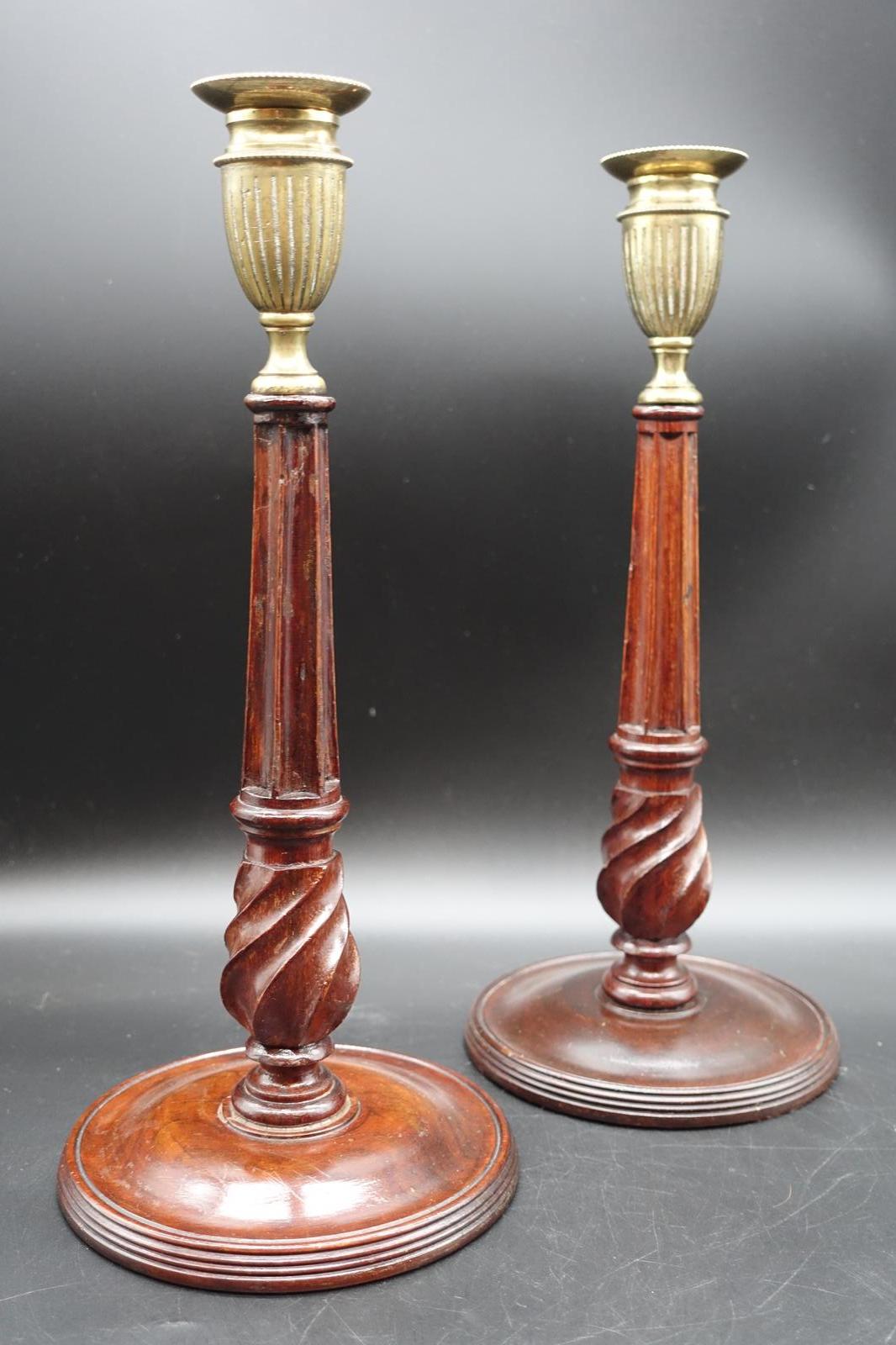 Fine Pair of George III Period Mahogany & Brass Candlesticks