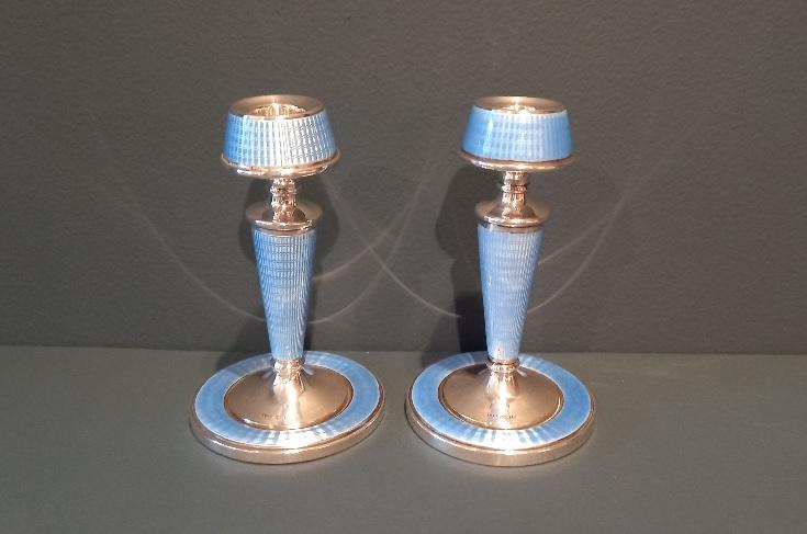 Fine Pair of George V Period Silver Blue Enamel Candlesticks