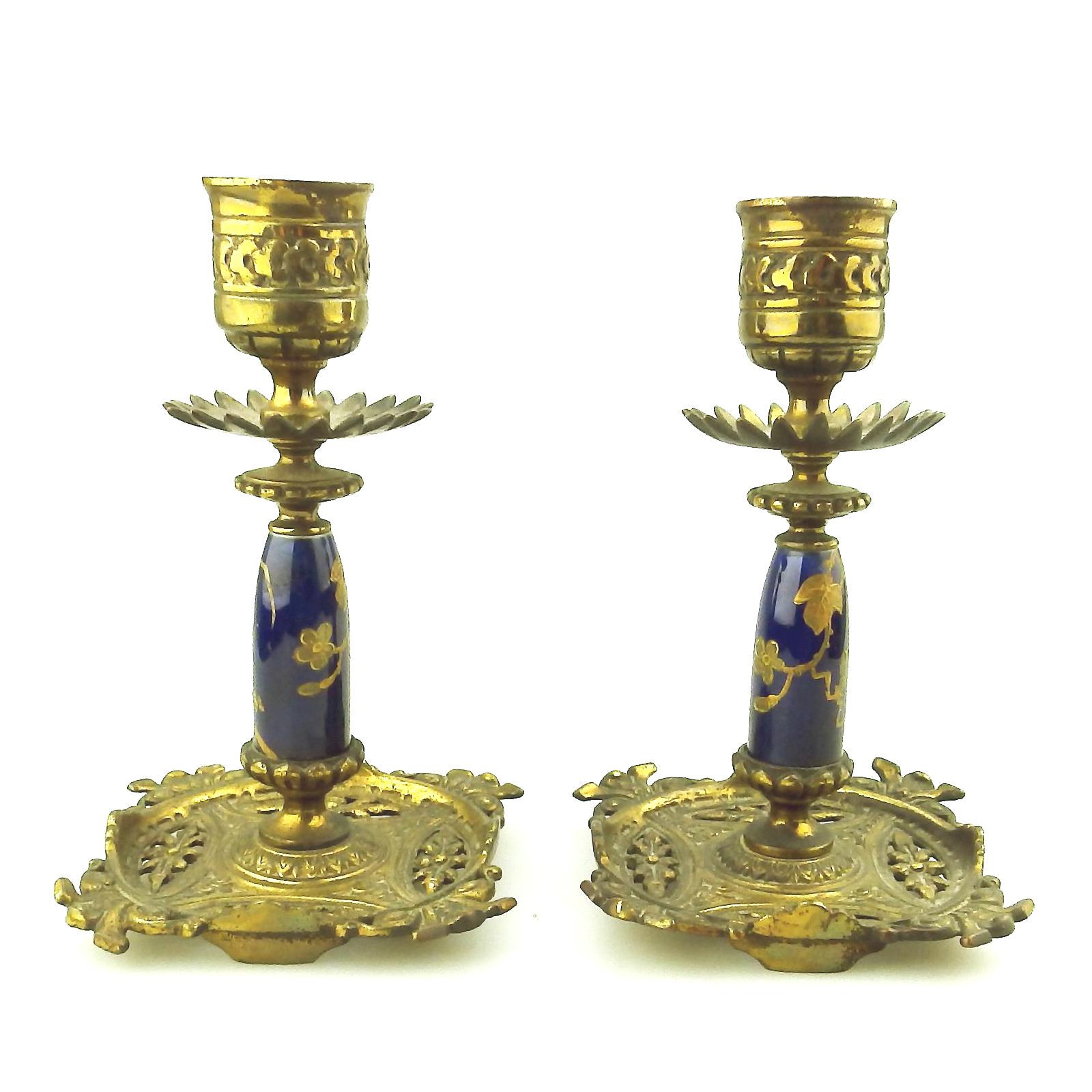 Fine Pair of Gilt & Porcelain Floral Candlesticks 19th Century