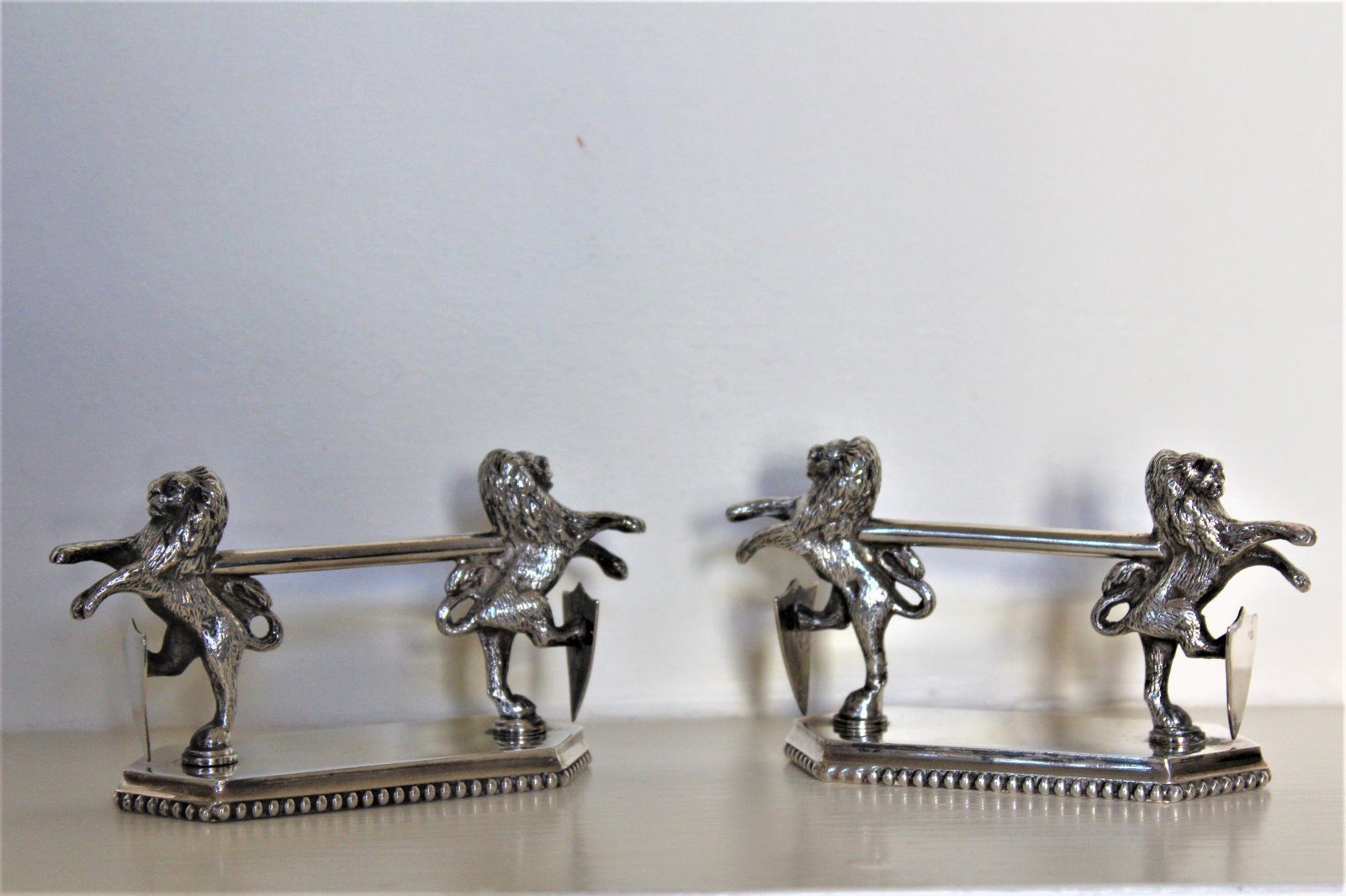 Fine Pair of Heavy Gauge Silver Plated Knife Rests of Rampant Lions with Shields English c.1900