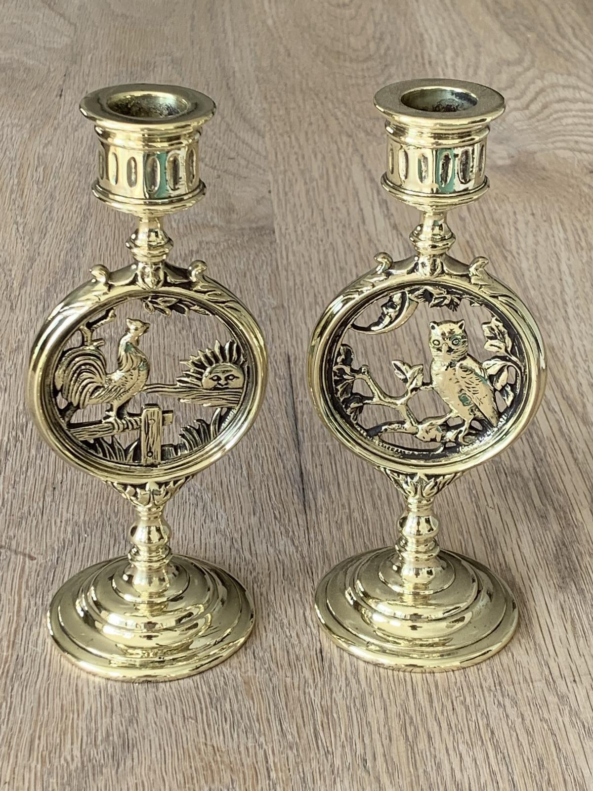 Fine Pair of Morning & Evening Owl & Cockerel Brass Candlesticks c.1882
