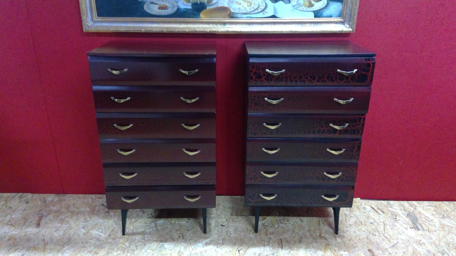 Fine Pair of Red Crackle Lacqured Highboy Designer Chests