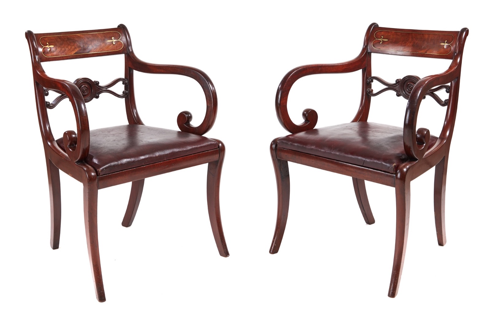 Fine Pair of Regency Mahogany Brass Inlaid Elbow Chairs c.1820