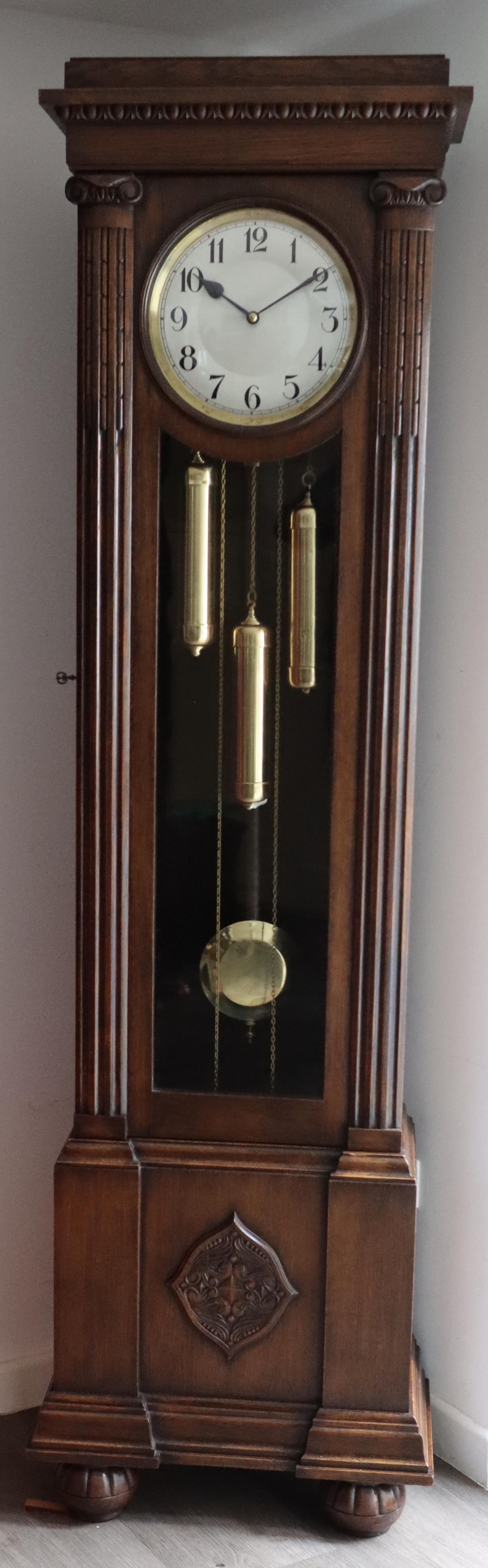 Fine Quality Oak Three Train Weight Driven Grandfather Clock