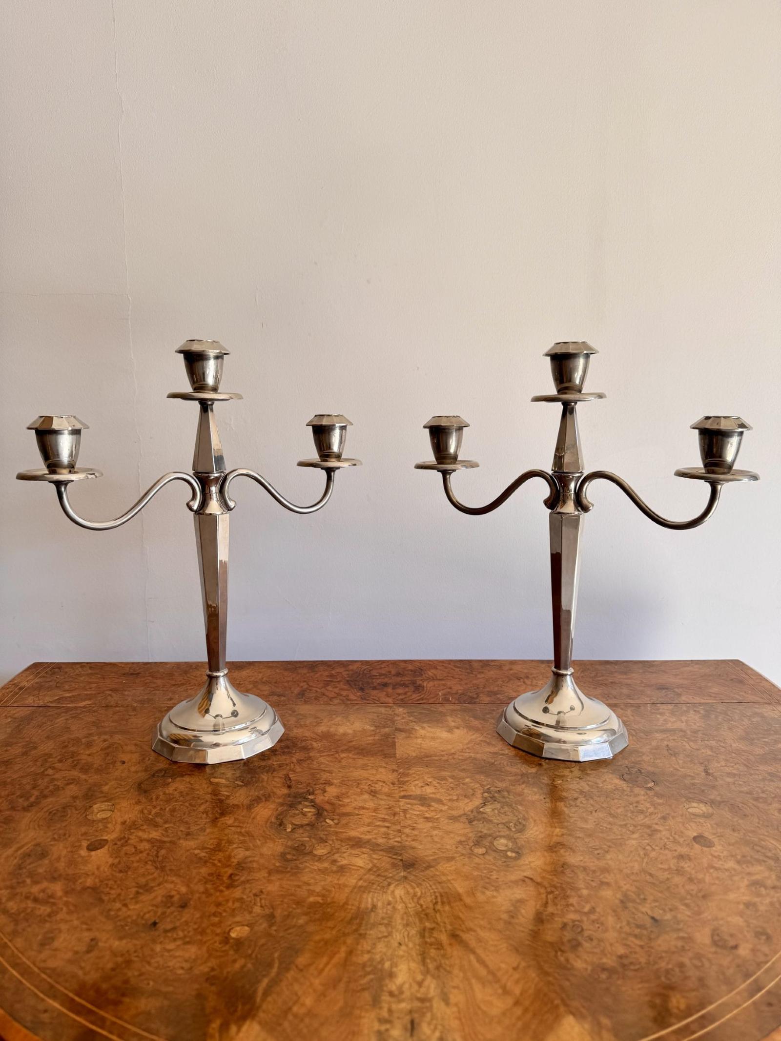 Fine quality pair of antique Edwardian silver plated candelabras, having a quality pair of three branch silver plated candelabras with a central silver plated holder with twin branches above a shaped central column, raised on a shaped base.