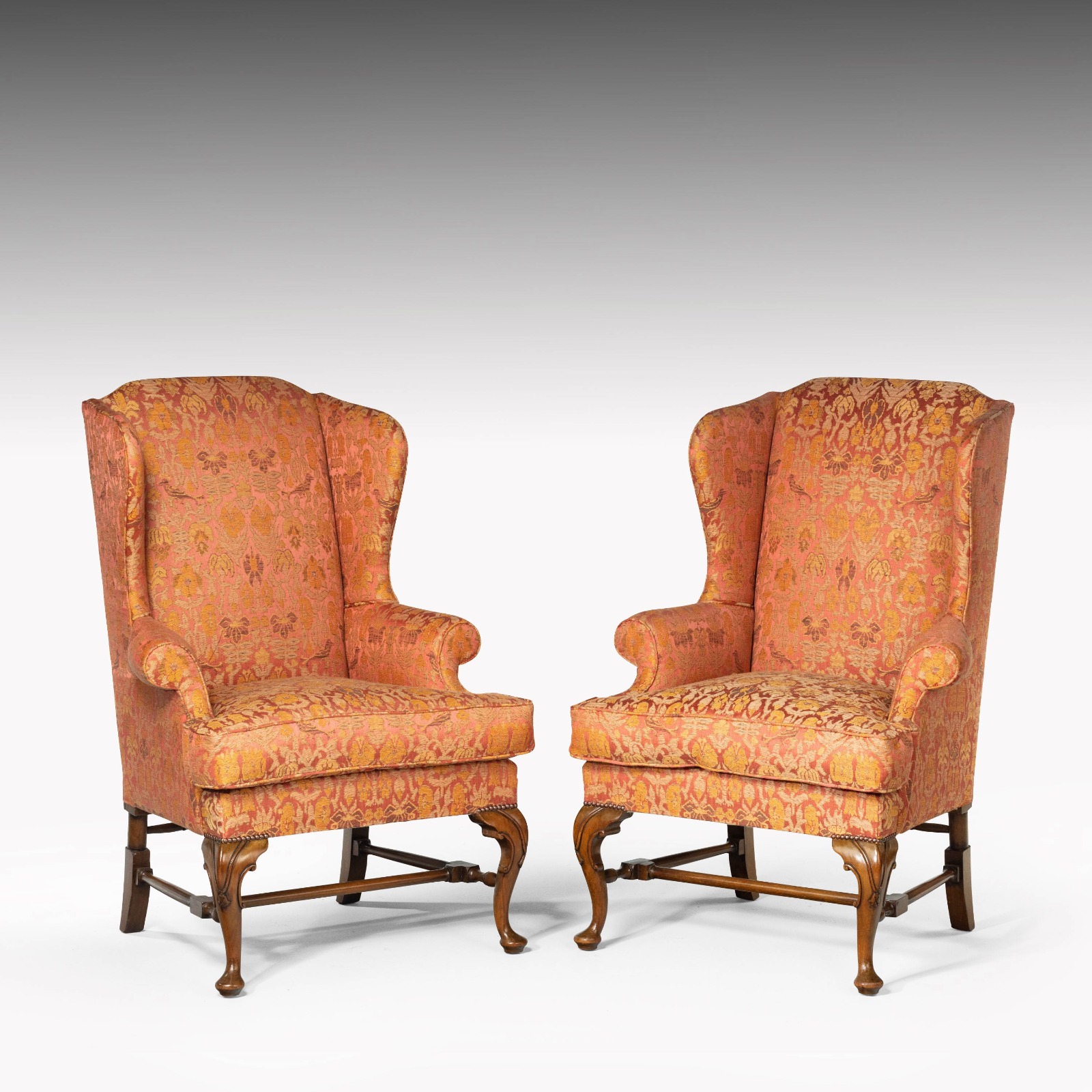 Fine Quality Pair of Early 20th Century Walnut Framed Wing Chairs