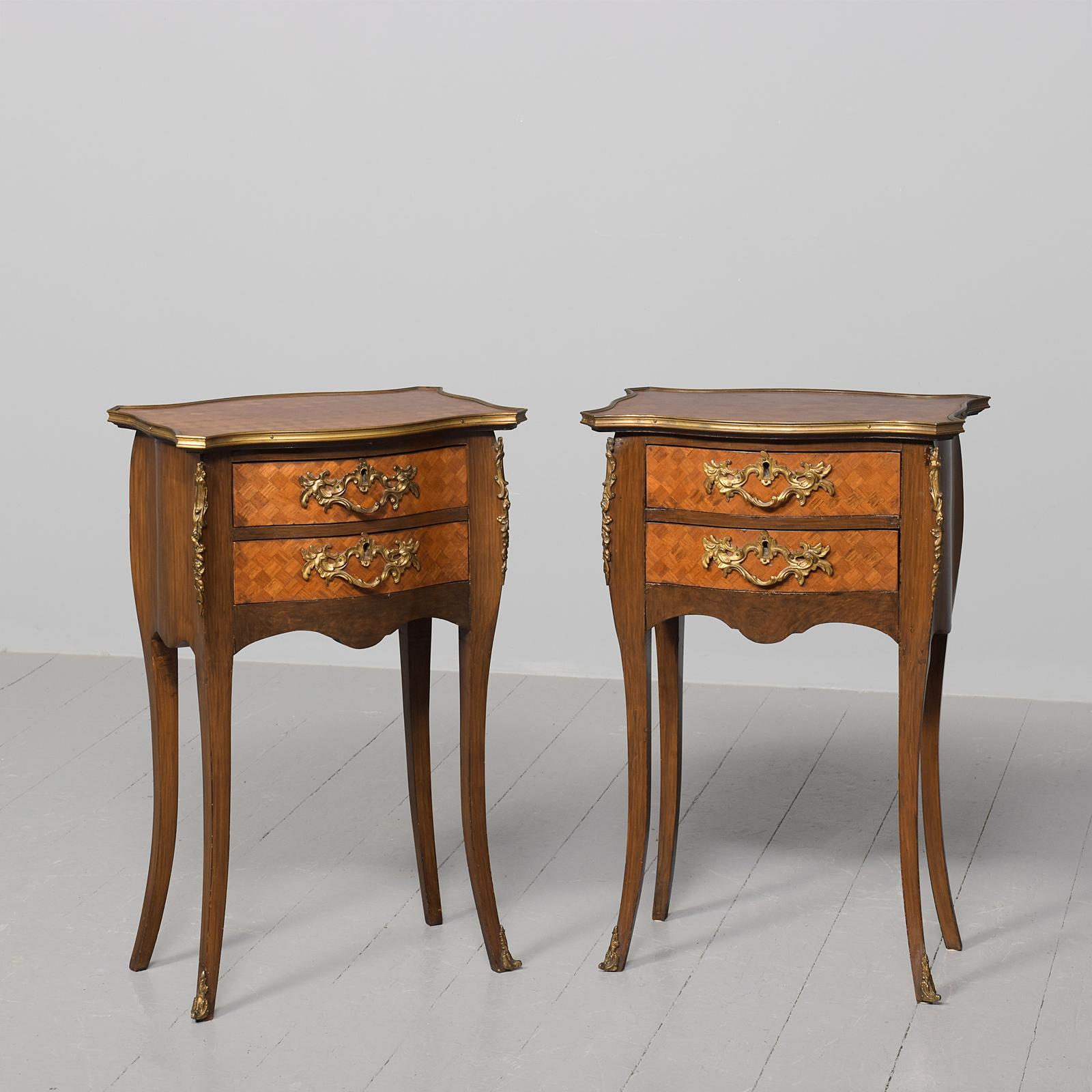 Circa 1890. Fine quality pair of French parquetry inlaid walnut lockers. The shaped tops covered in parquetry inlay in perfect condition, with cast brass fore-edges above two serpentine drawers with solid mahogany drawer linings and bronze rococo style handles and escutcheons, with shaped sides and supported on tapering cabriole legs with foliate capitals with brass sabots.