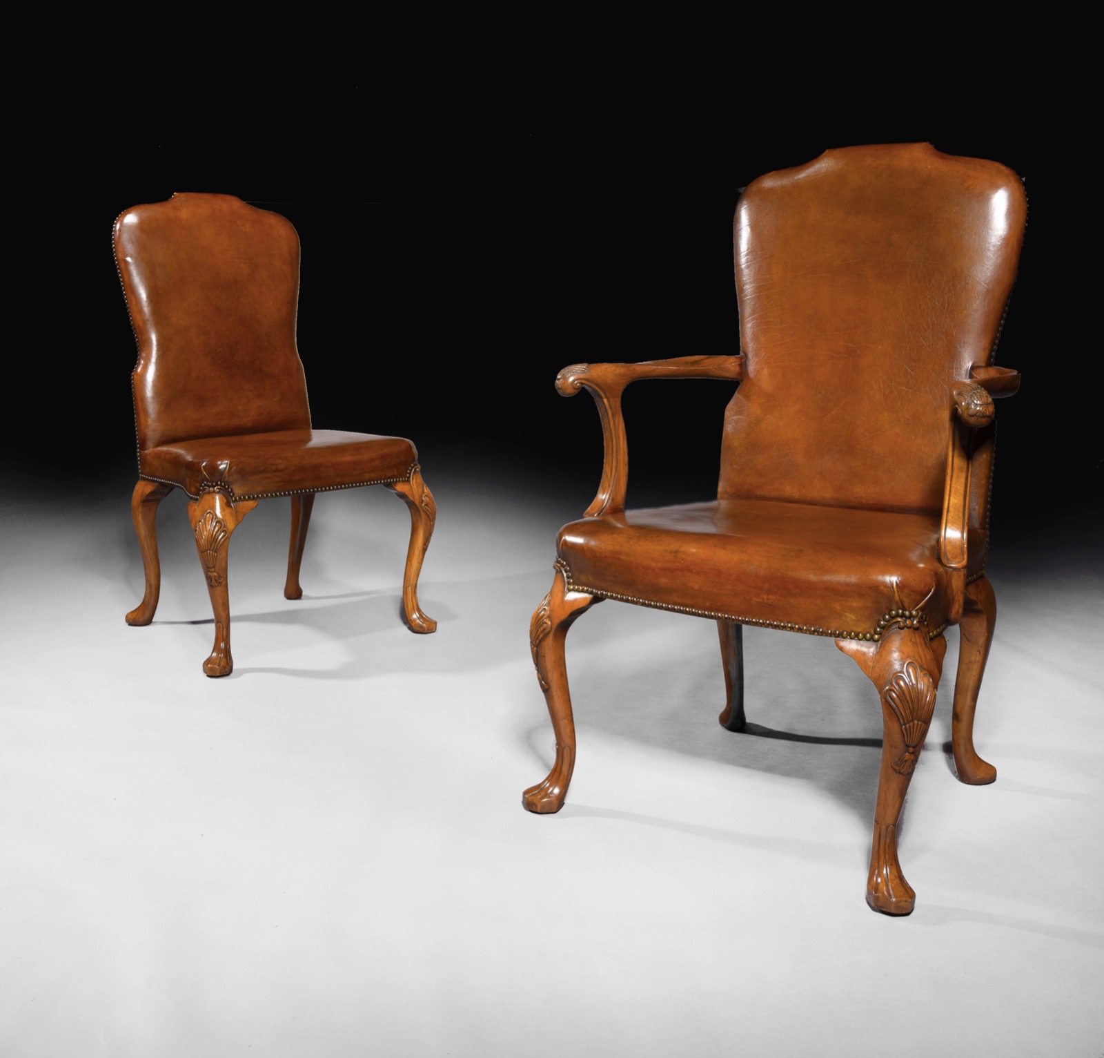 Fine Set of 8 (6 & 2) Generously Sized Antique Walnut & Leather Dining Chairs