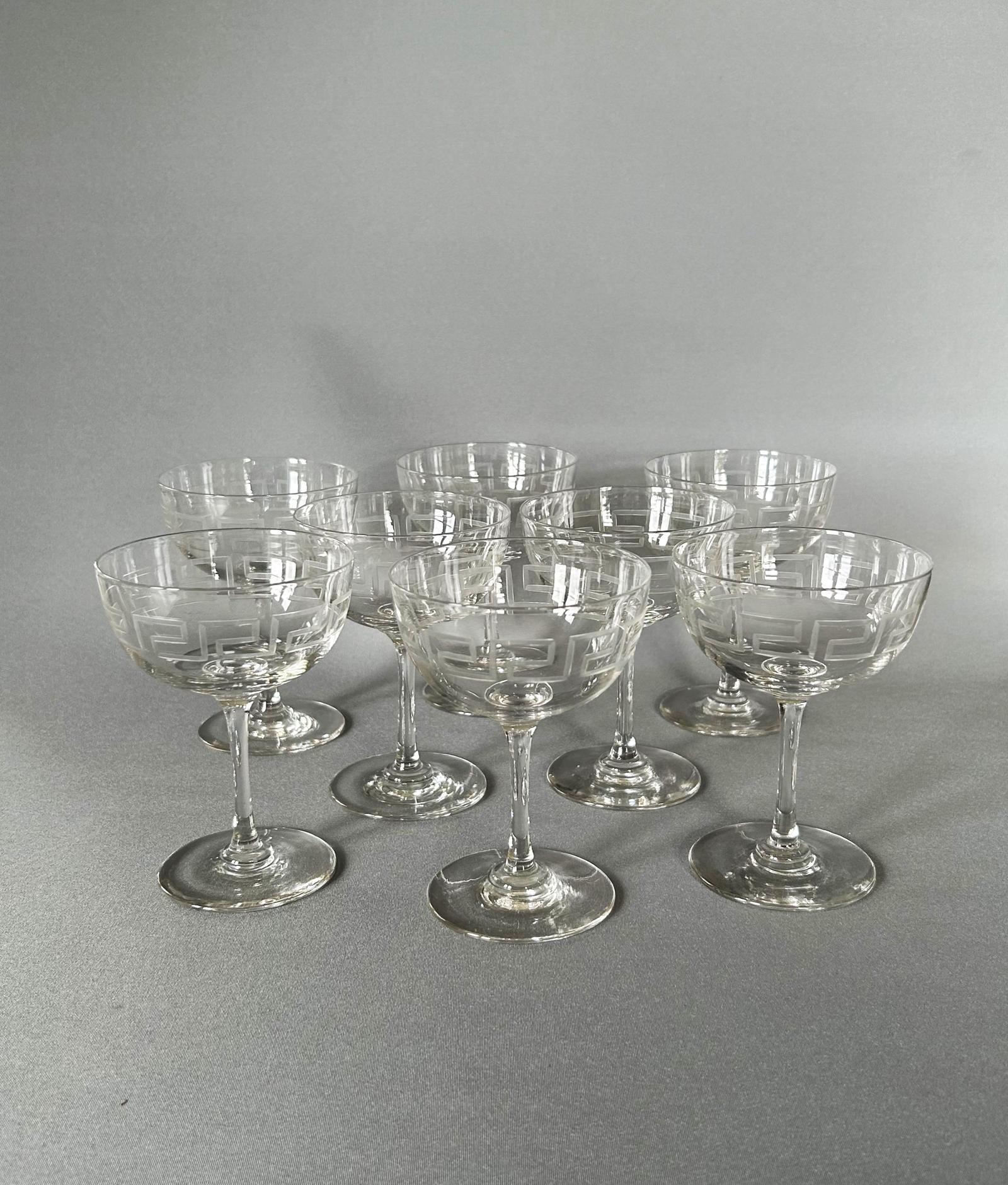 Fine Set of 8 Victorian Greek Key Etched Champagne Bowls