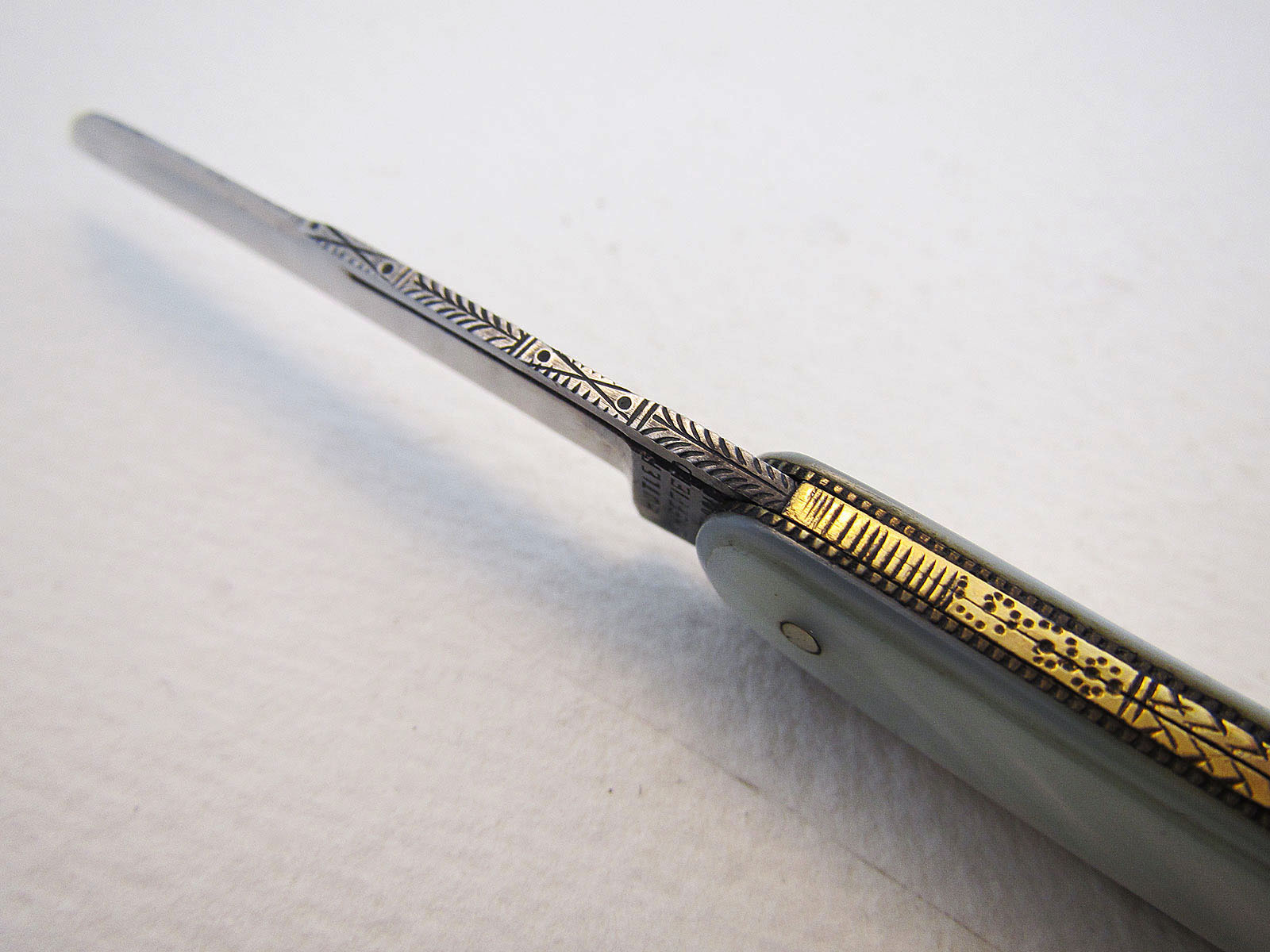Fine Sheffield Double Bladed Mother of Pearl & Stainless Steel Folding Pocket Fruit Penknife. Butler / Cavendish. Gold Spine C.1920