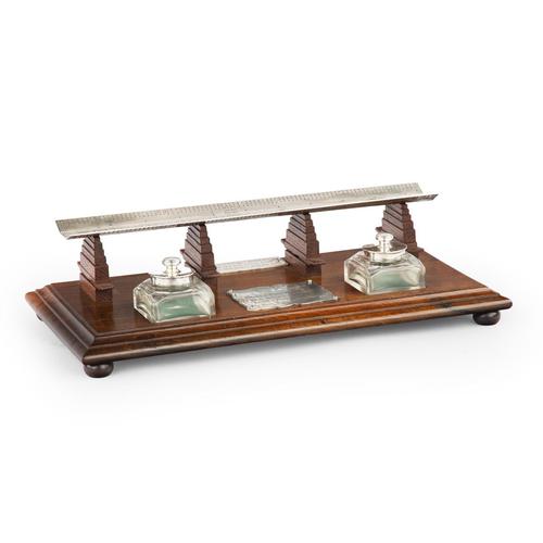 A fine silver mounted presentation penholder Commemorating the Laying Down of the Battleship HMS King George V made from the Timbers of the Royal Yacht the Royal George, 1911 This fine and elaborate oak inkstand consists of an oak base, made from timbers salvaged from the Royal yacht Royal George and then fitted with a large silver plated pen tray, two inkwells and two engraved presentation plaques. The plaques record the fact that this piece was made in the form of a keel plate to commemorate the laying down of the battleship HMS King George V, the ceremony carried out by Lady Curzon-Howe who received this fine piece in return for her service. Provenance:- Presented to Lady Curzon-Howe on the 16th of January 1911 and thence by family descent. HMS King George V:- The first of the fleet of new battleships designed to meet Britain’s requirements from 1911 onwards, King George V served with distinction in both the home and grand fleets, often serving as the flagship. She was famously involved in the fierce fighting at the Battle of Jutland and, after the war, continued to serve as flagship of the home fleet before later serving in the Mediterranean. She was finally scrapped in 1926 after a further period in use in the reserves and as a training ship. Lady Curzon-Howe:- Born in 1887, Mary Curzon, Lady Curzon-Howe, married her cousin Francis Curzon, Commander-in-Chief at Portsmouth, in 1907. She was a celebrated society figure and one of the great beauties of her age, famously referred to as the ‘Queen of Beauty’ having played that role in the revival of the Eglinton Tournament in 1912. Cecil Beaton, in his The Book of Beauty, referred to Lady Curzon-Howe as ‘the elegance of the aristocrat combined with the excessive prettiness that accompanies carnation-pink cheeks and yellow hair. She is gracefully statuesque, her height is superb, her neck swan-like, and her poreless complexion is like icing-sugar on a birthday cake….there is no living beauty who can create more of an effect than she when entering a ballroom or sitting in a box at the opera’.