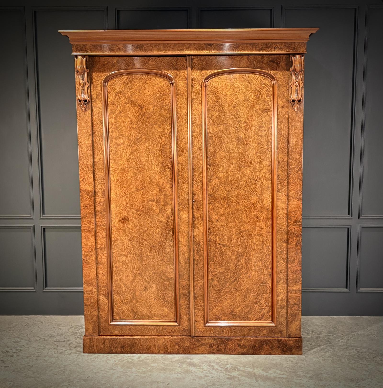 A stunning 19th-century Victorian burr walnut wardrobe of exceptional quality, presented in very good condition.