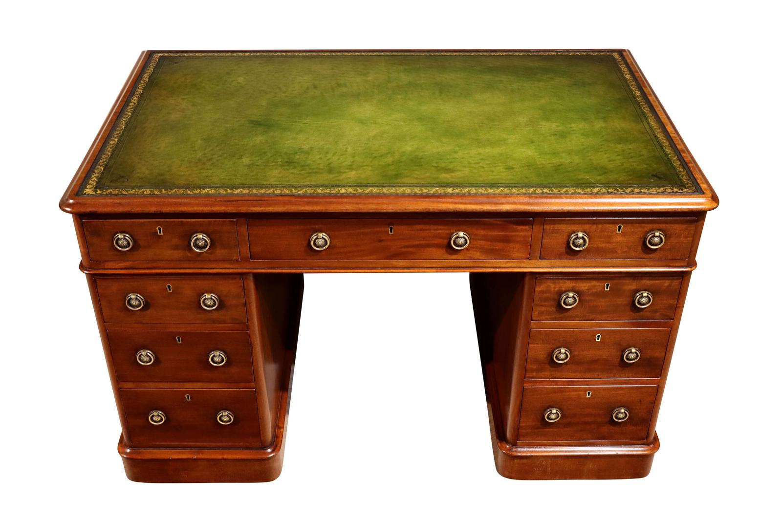 Fine Victorian Mahogany Pedestal Desk with Green Leather Top, c.1870
