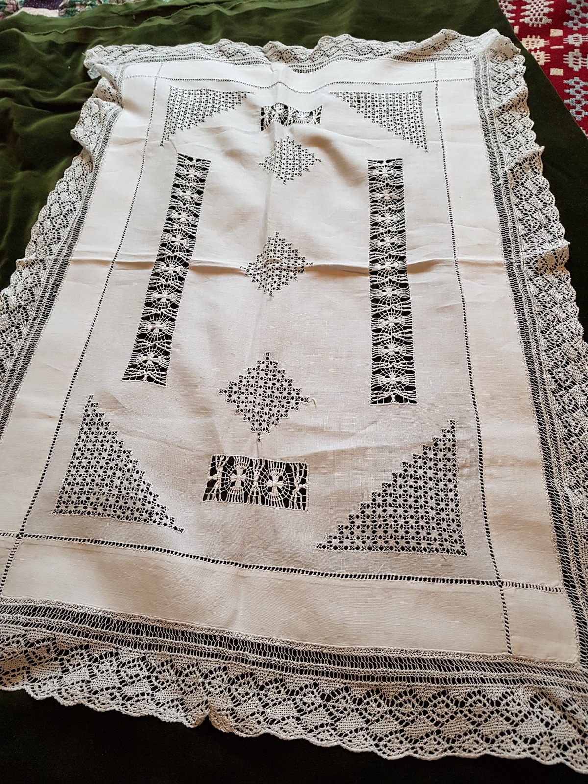 Fine White Linen Tray Cloth, Tenerife Style Drawn Work, & Delicate Knitted Edge