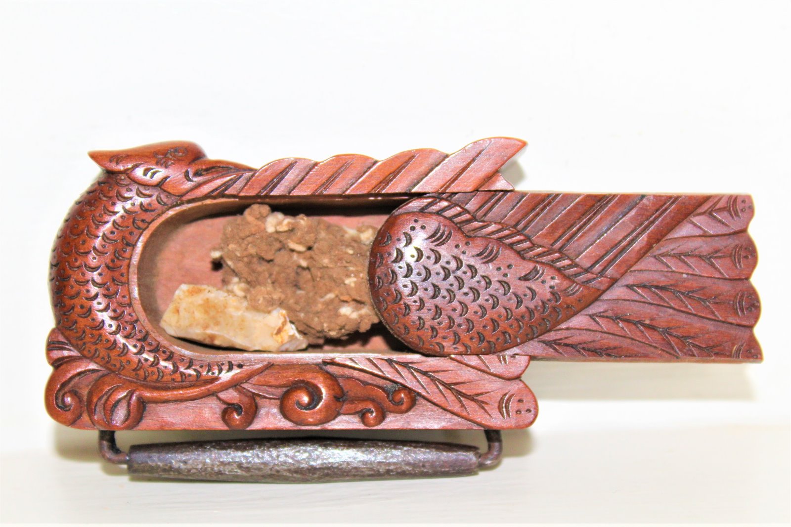 Finely Carved Boxwood Tinder Box Depicting a Stylised Peacock Possibly Chinese c.1800 to 1880 Good Patina