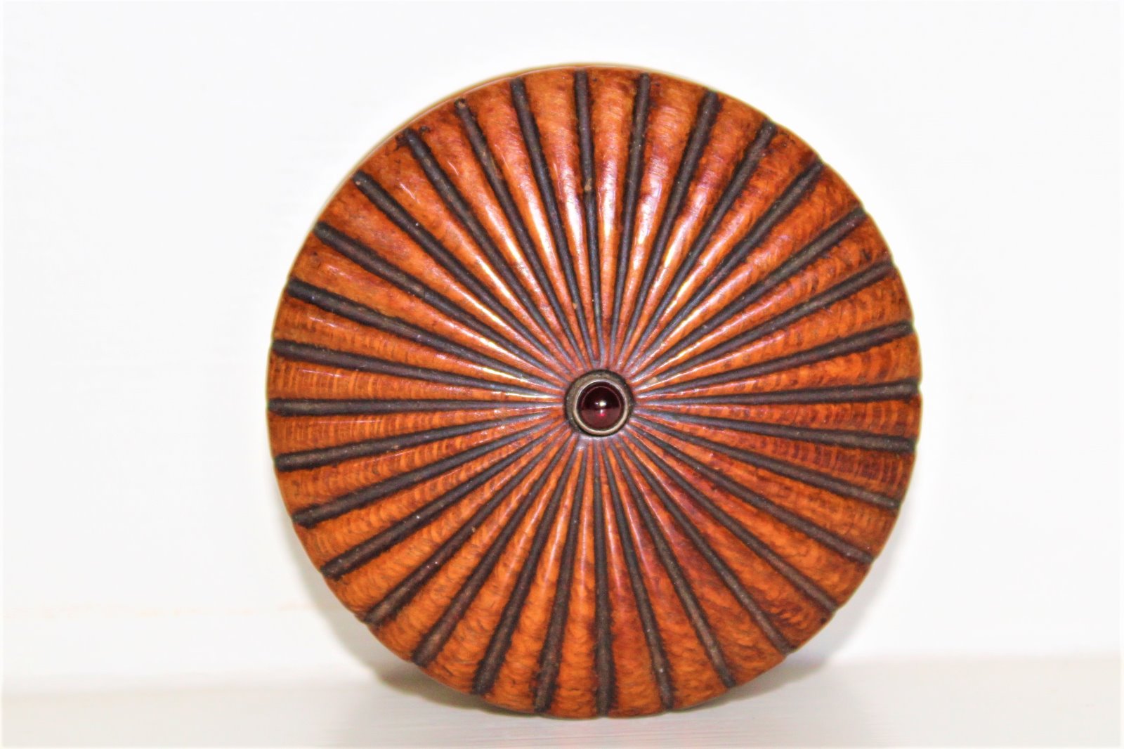 Finely Carved Circular Snuff Box in Burr Elm with a Well Defined Sunburst on the Lid Encircling a Small Ruby Possibly English c.1880