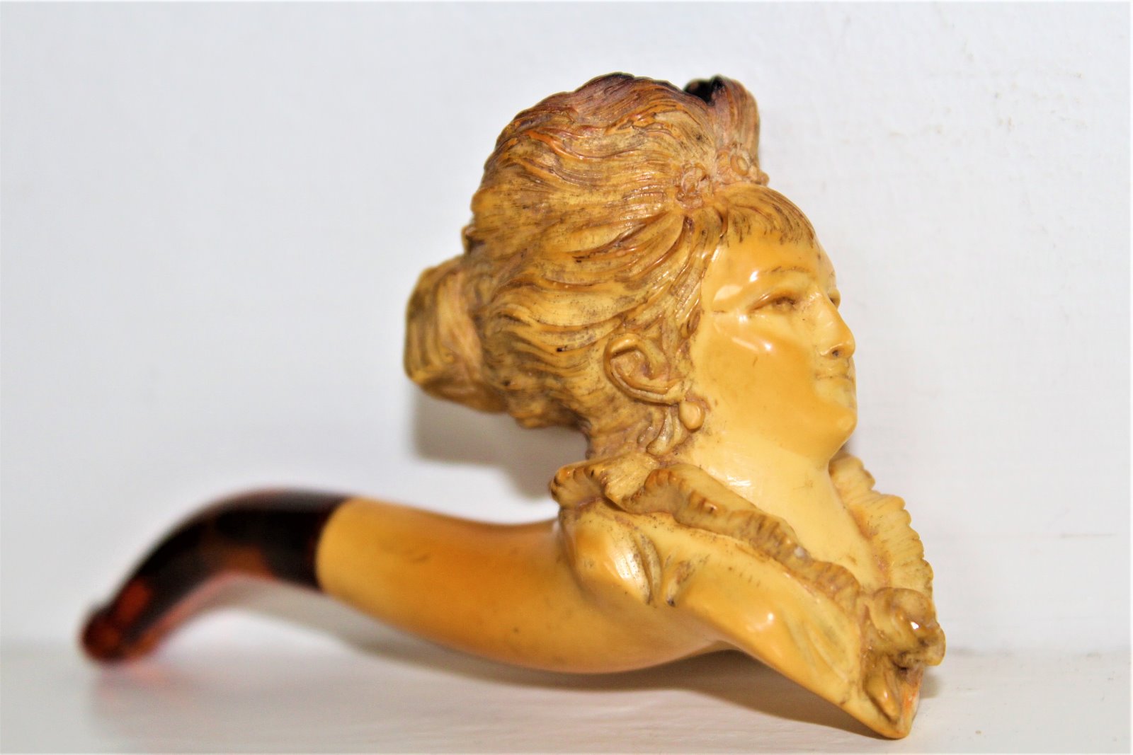 Finely Carved Meerschaum Pipe Depicting a Lady with Elaborate Hair Style & Amber Mouth Piece in Original Case English c.1880