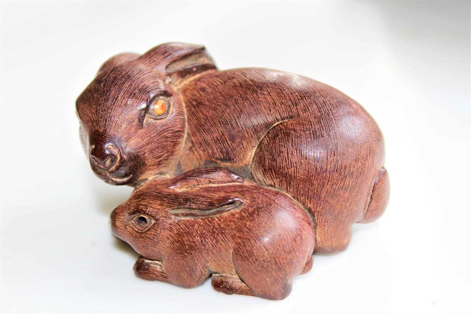Finely Carved Wood Okimono of a Rabbit & Its Young