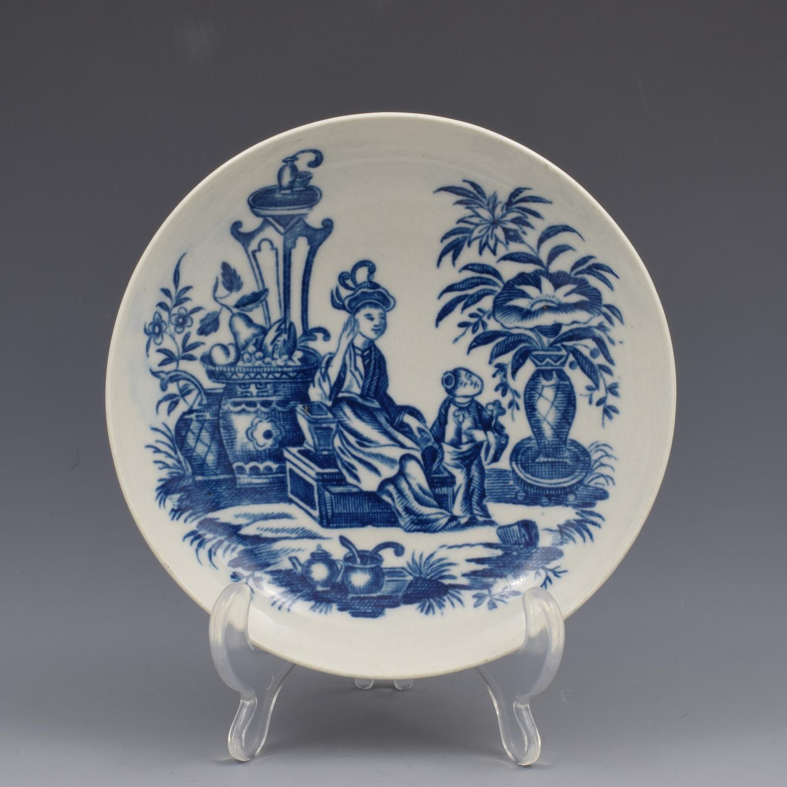 First Period Worcester Blue & White Porcelain Saucer Mother & Child c.1775