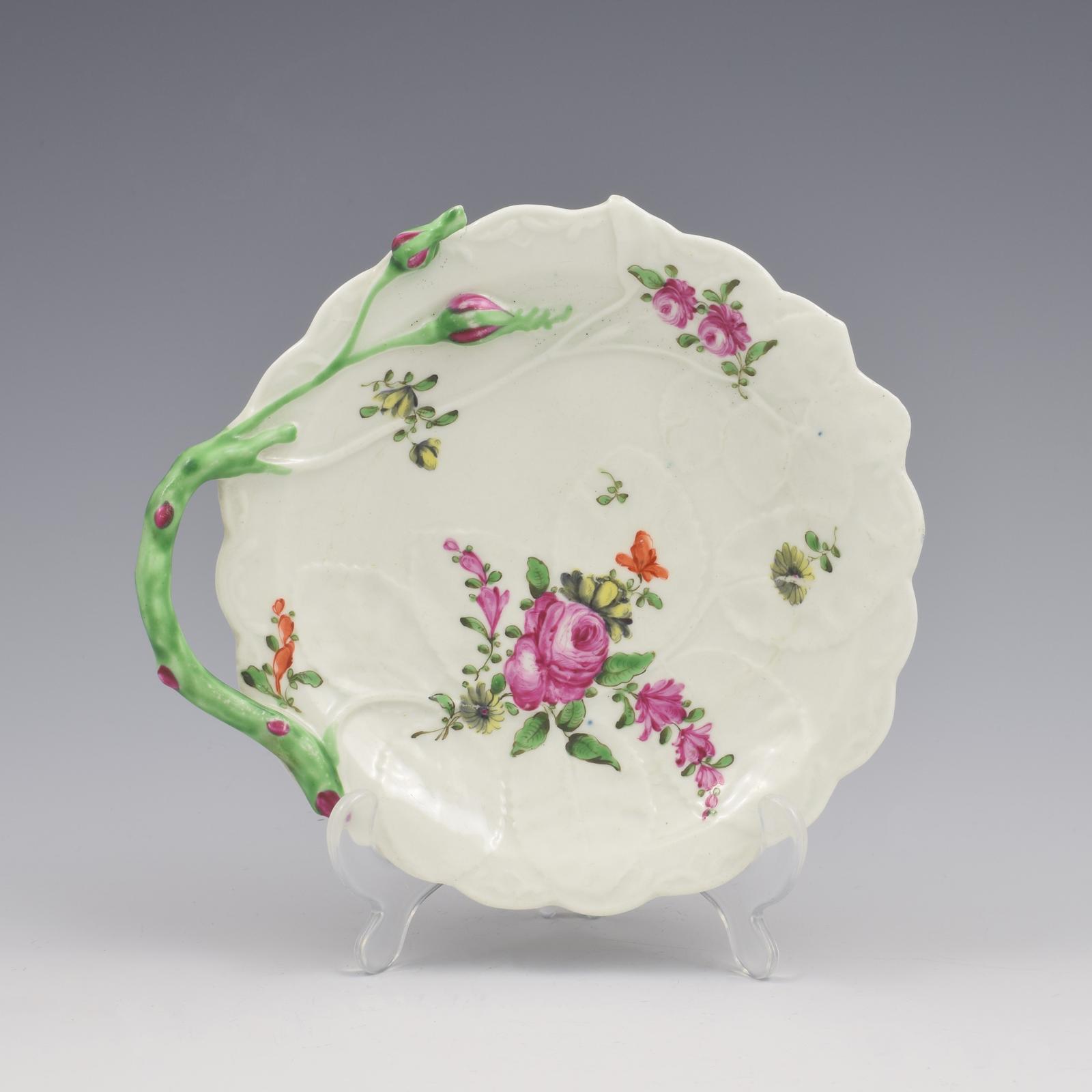 A very pretty Worcester porcelain sweetmeat dish in the so-called "Blind Earl" shape with rose leaf surface moulding and edged rim. Finished with an applied stem moulded handle branching into rose buds. Lovely bright enamels to the handle and buds, and various hand painted floral sprays and sprigs are scattered over the surface. c.1770.
