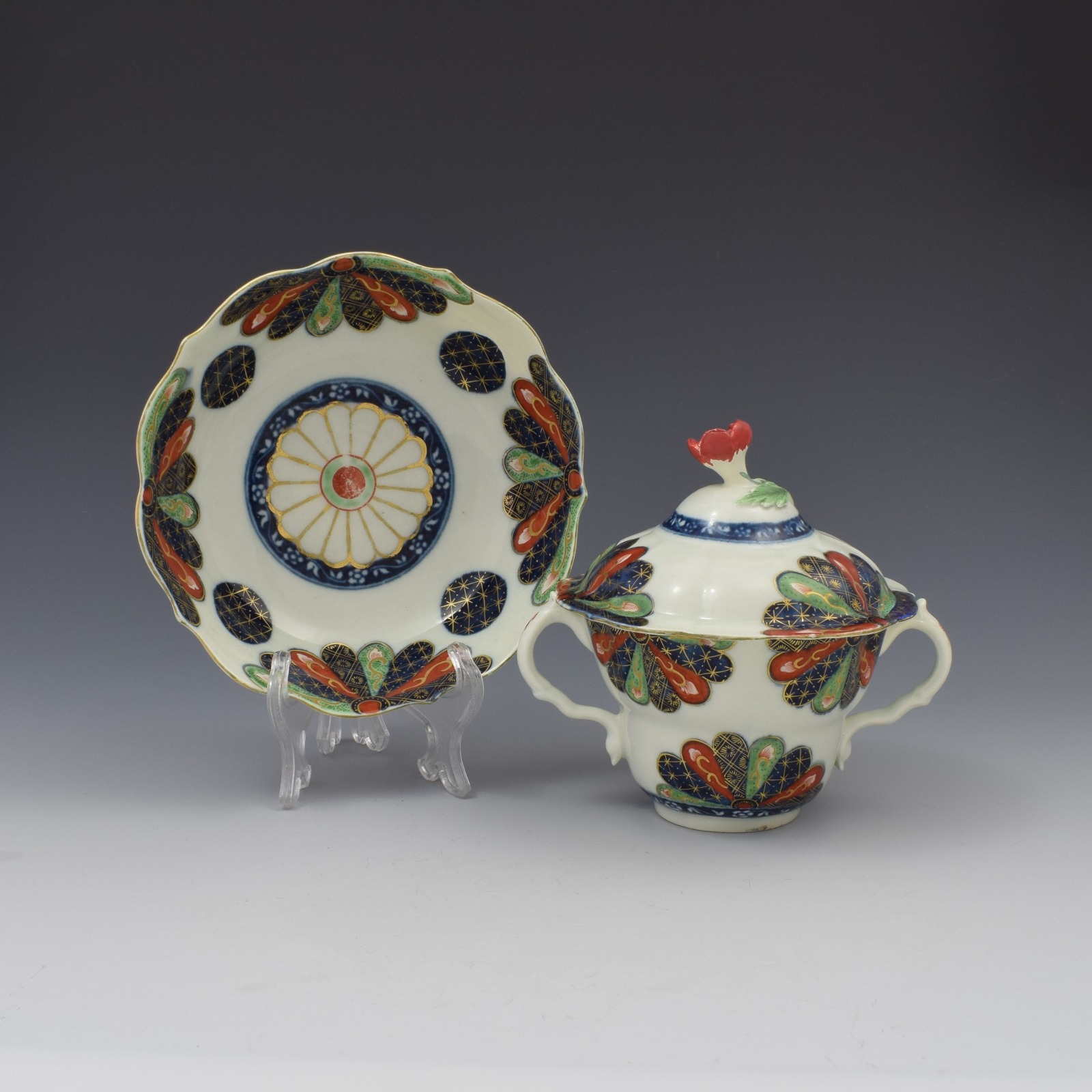 First Period Worcester Porcelain Old Japan Fan Chocolate Cup, Cover & Stand c.1770 (1 of 23)