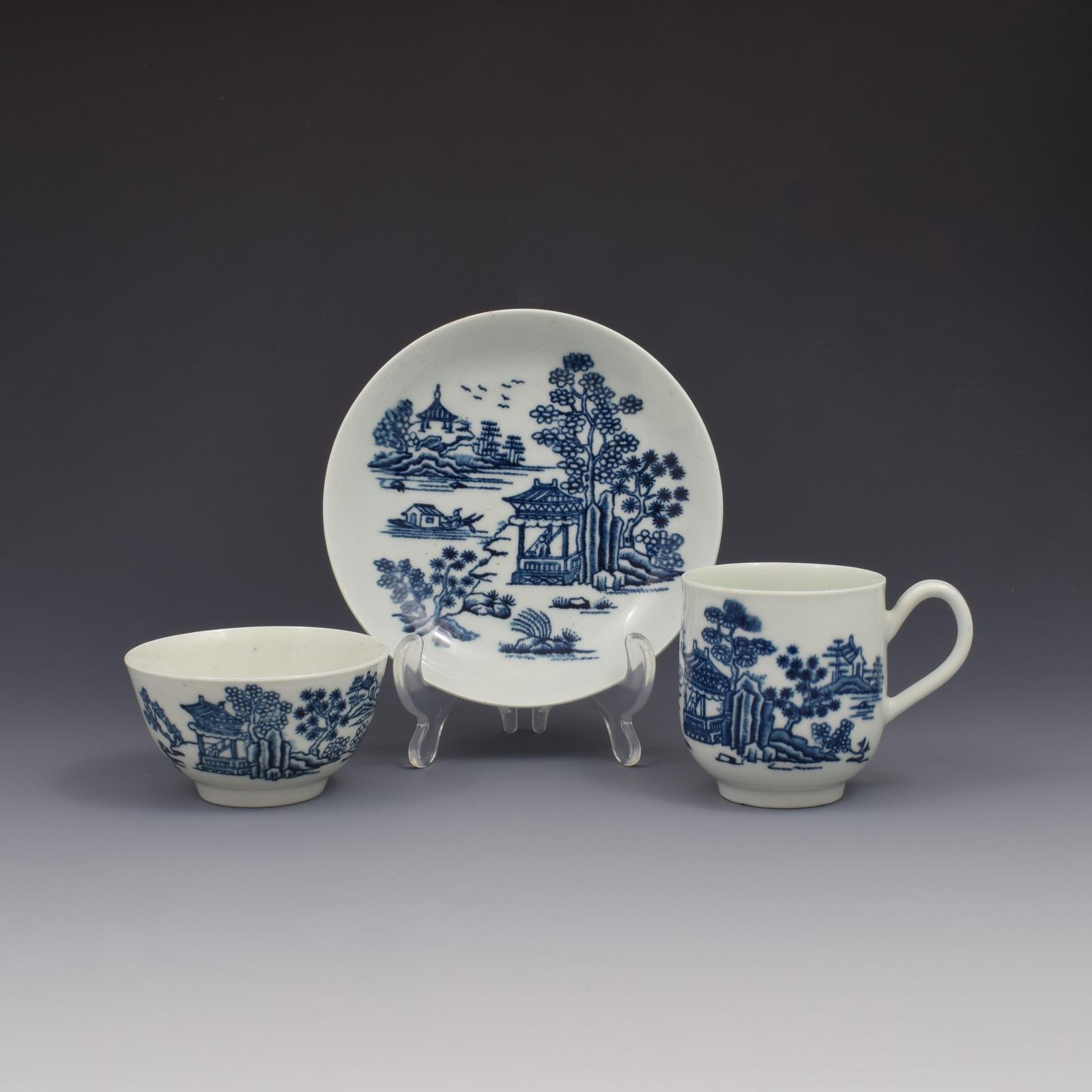 First Period Worcester Porcelain Tea & Coffee Trio The Man in the Pavilion Pattern c.1760