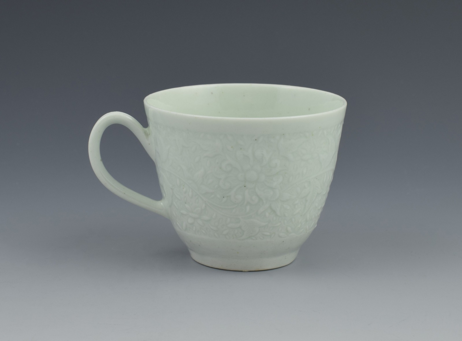 First Period Worcester White Glazed Chrysanthemum Relief Moulded Coffee Cup c.1765