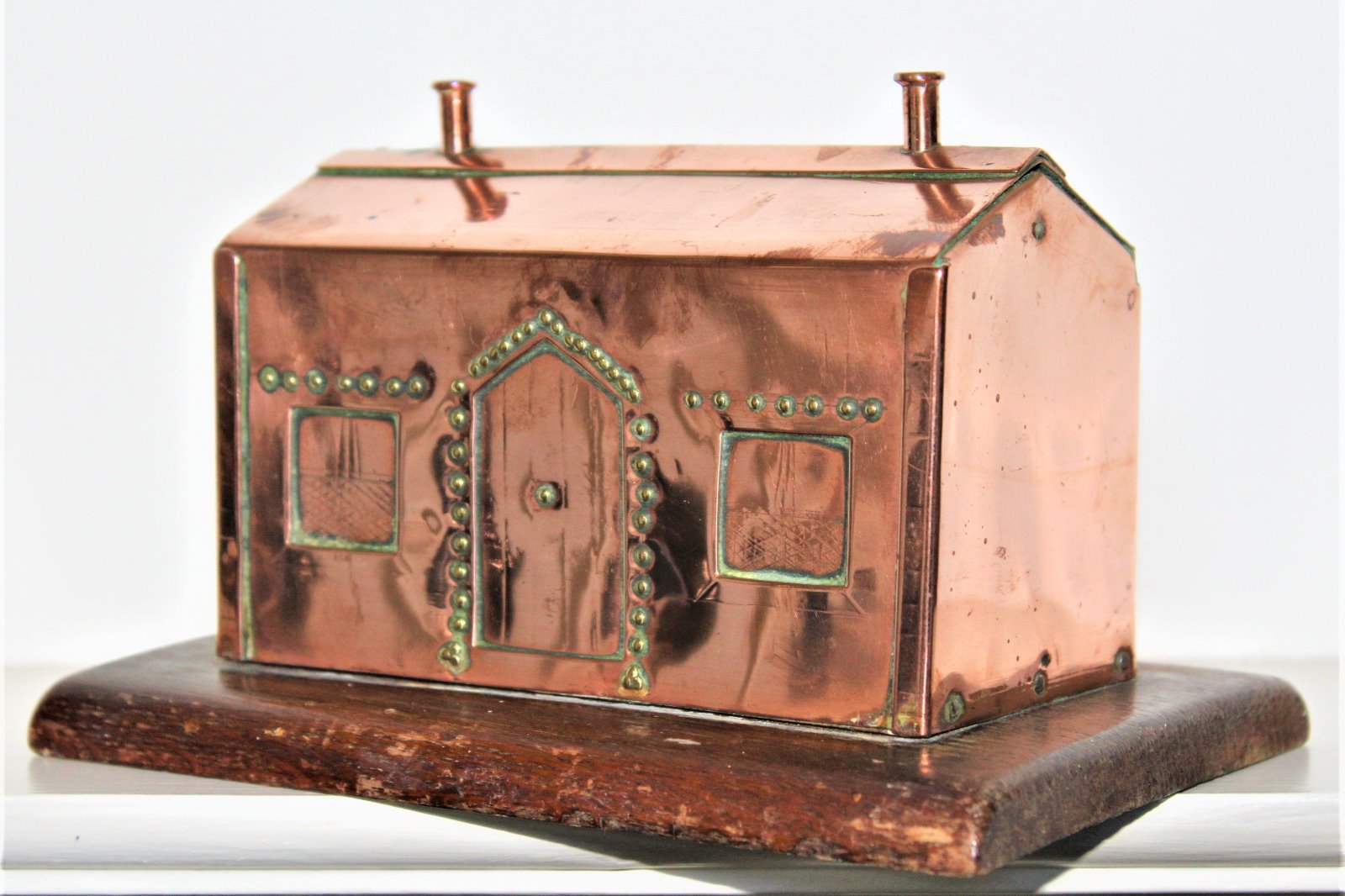 First World War Charming Trench Art Cottage Made of Copper with Brass Studs and Fixed to an Oak Base & Possibly Made by a Prisoner of War English c.1918