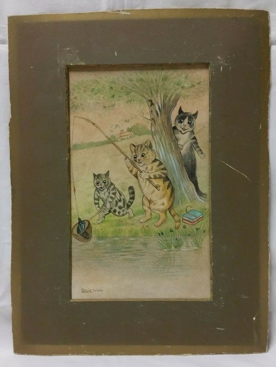 'Fishing Cats' Unframed Watercolour Painting on Artists Board in the Style of Louis Wain