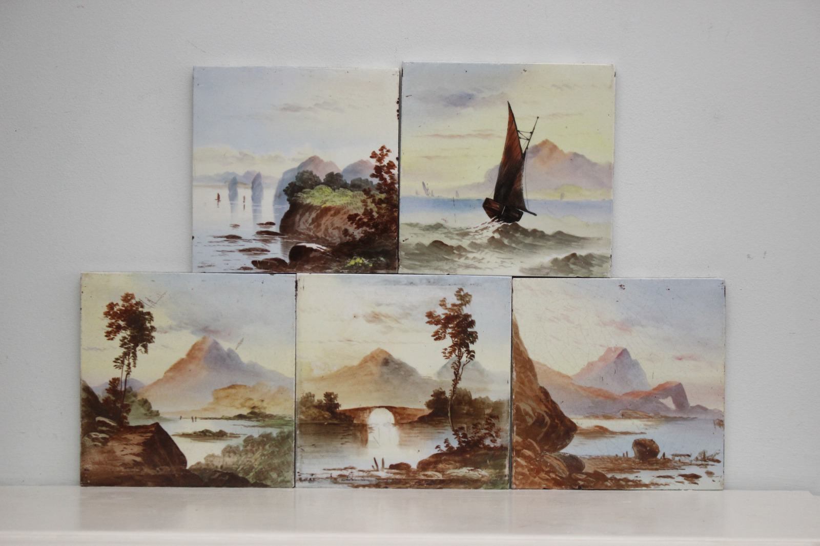Five Antique Hand Painted Tiles Depicting Rural & Ocean Scenes, Highlands