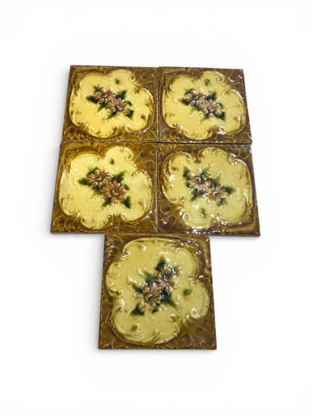 Five matching antique ceramic glazed 6 inch square tiles made around 1900 probably. Commonly used in old cast iron fireplaces (they usually have 5 down each side) or in wash stand splashbacks, though they can be used in lots of decorative situations. These ones have an embossed, tube-lined floral design with a cream and brown background. Price is for all five Dimensions: 150mm sq x 10mm