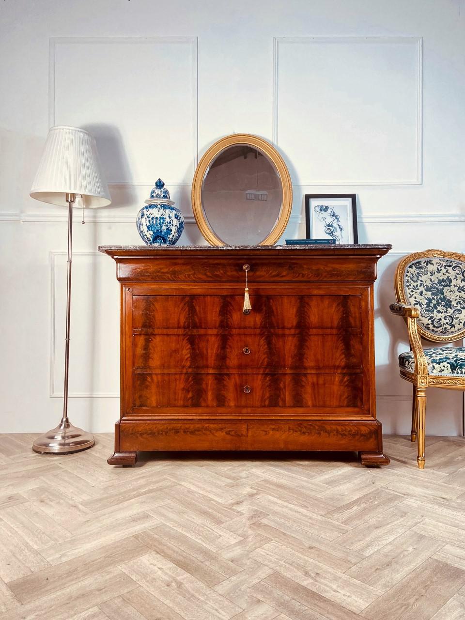 Flamed Mahogany Drawers / French Antique Chest of Drawers / Commode