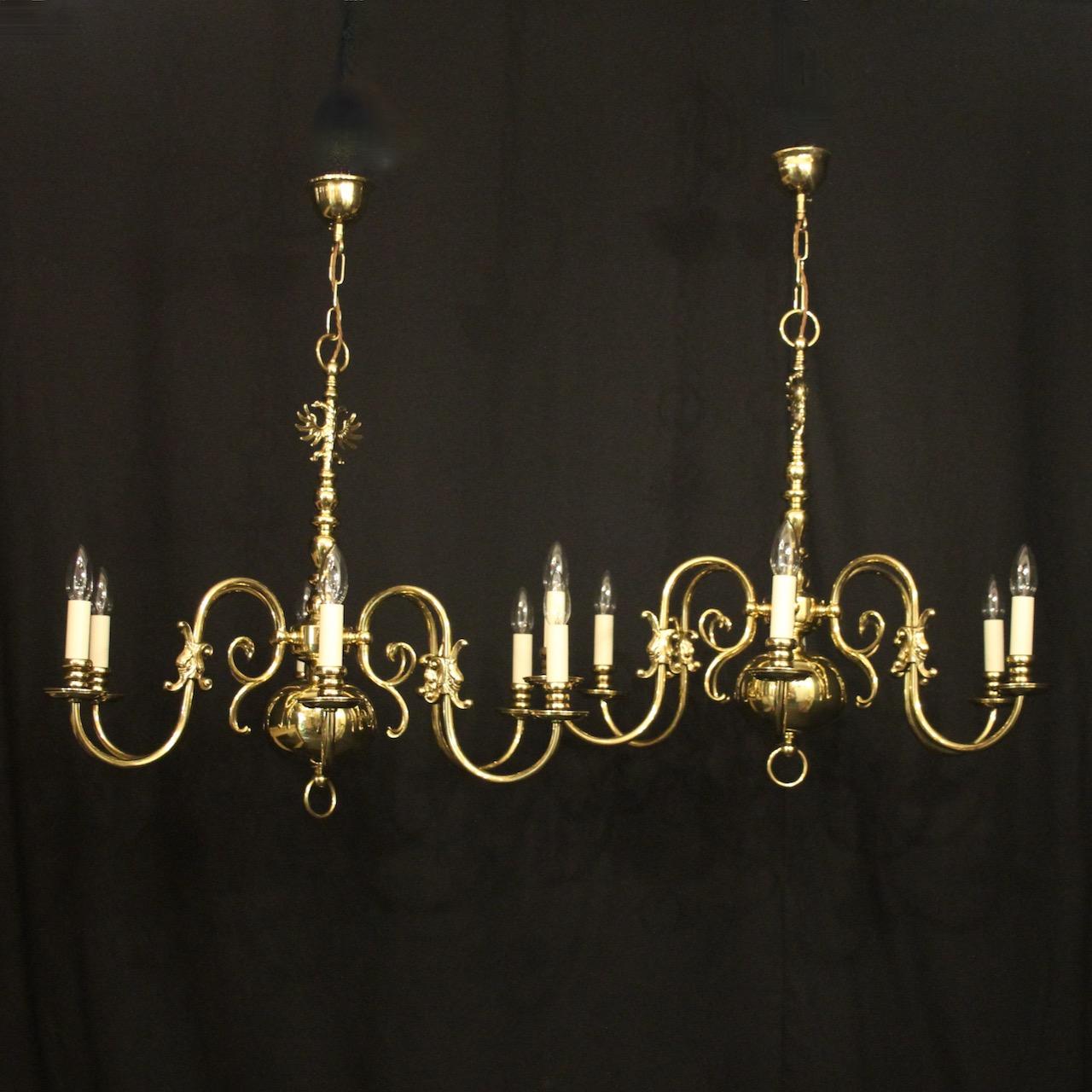 Flemish Pair of 6 Light Brass Chandeliers