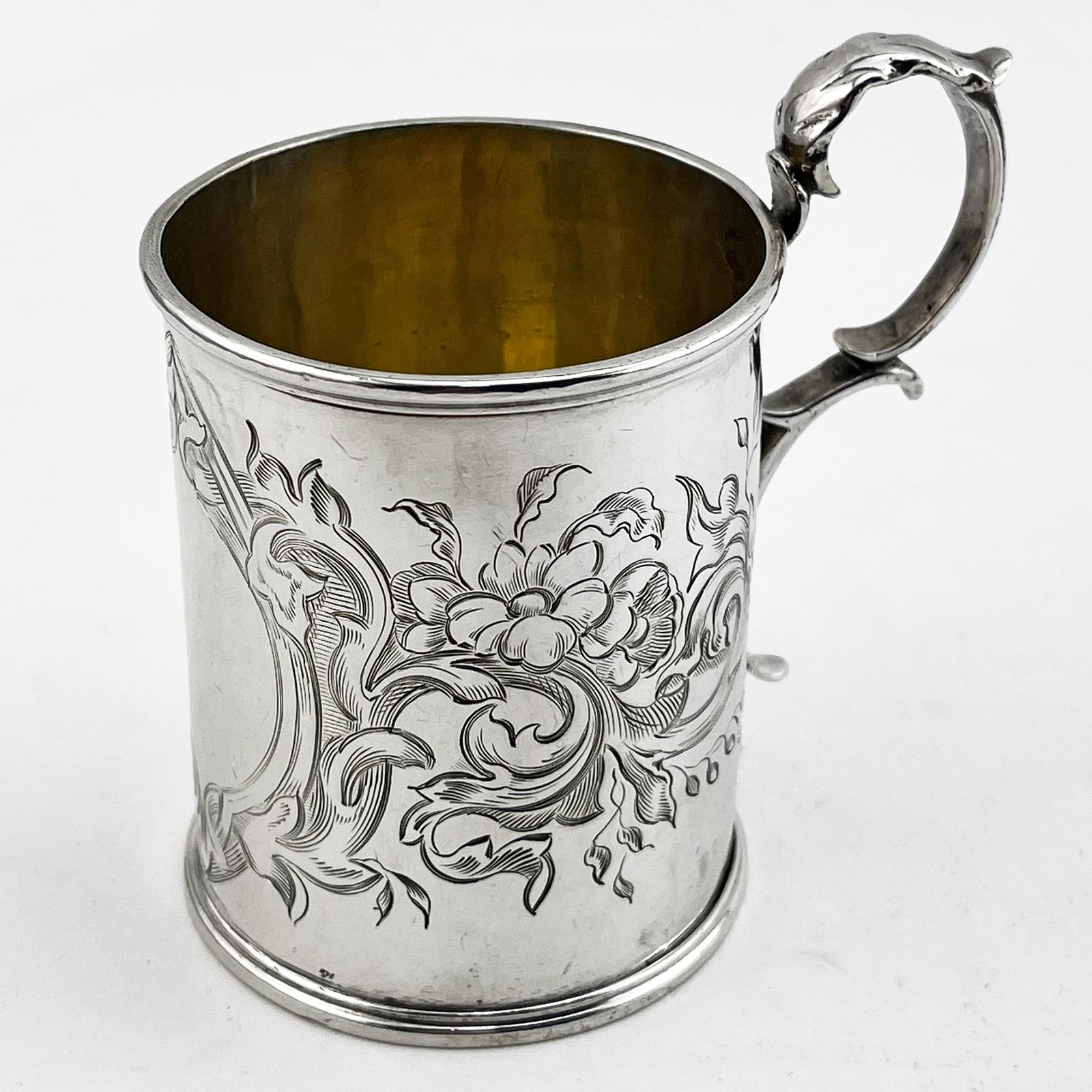 A very pretty floral engraved Victorian sterling silver christening mug. Cylindrical form body deeply engraved with foliage and floral decoration around the body with vacant cartouche and double scroll leaf capped handle. Very good clean condition without any inscriptions in the cartouche.