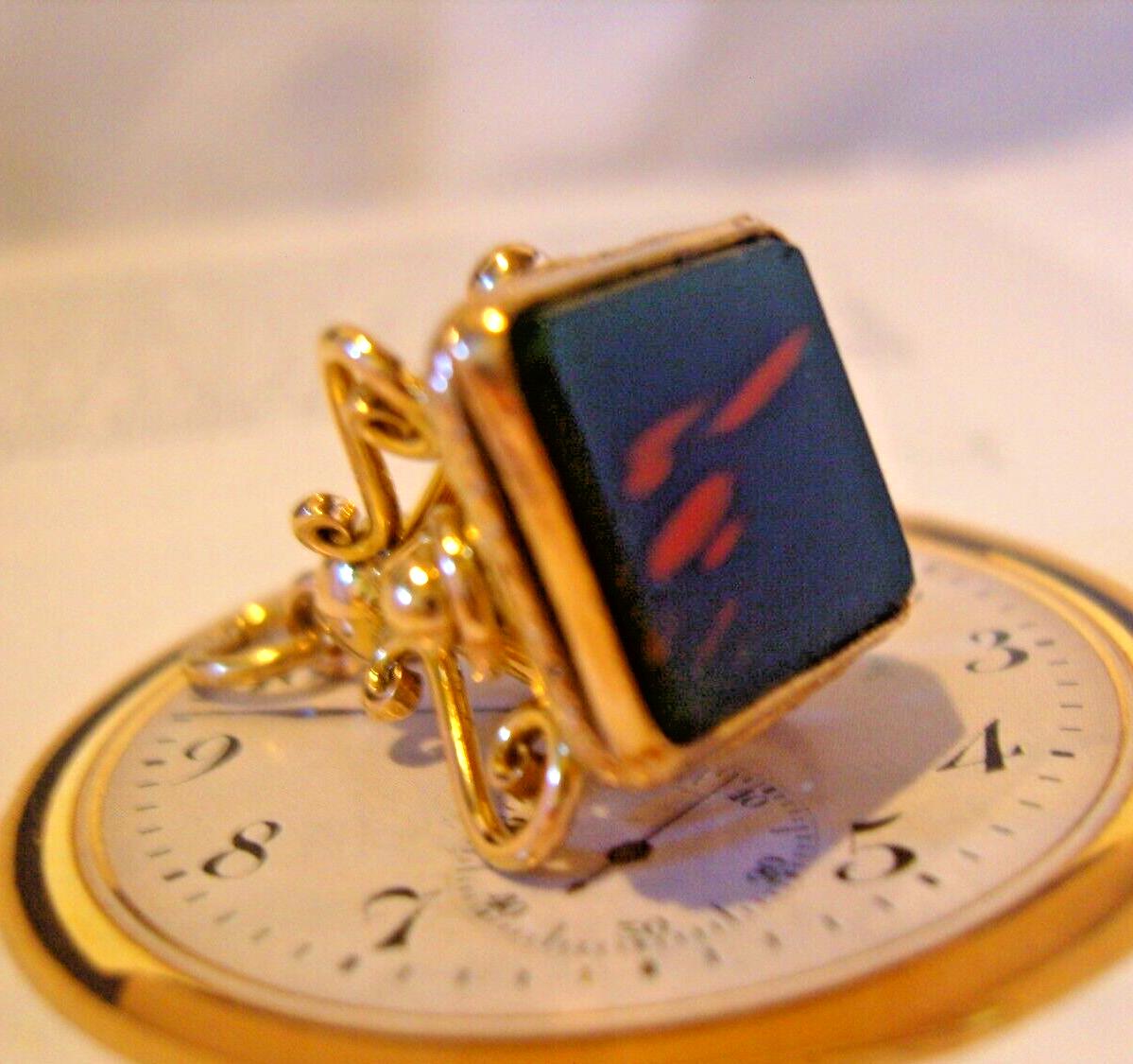 Fob 1970s 10 Gold Plated & Bloodstone Pocket Watch Chain Large Ornate Fob